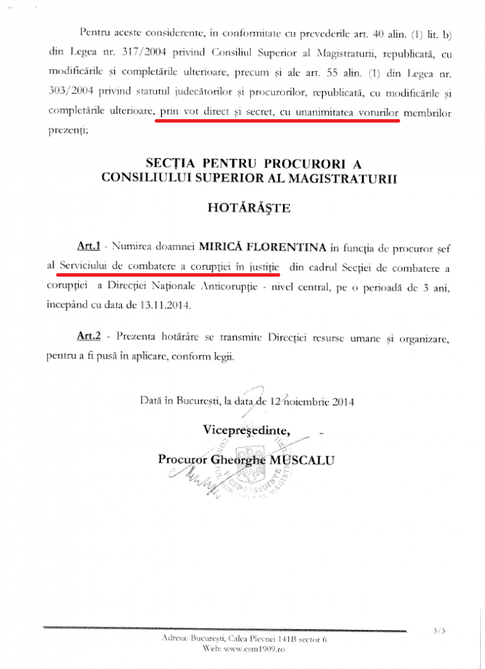 La pagina 12 din raport Laura Codruta Kovesi afirma ca CSM a avizat “in mod operativ” aceste schimbari pe care le-a propus. Si asa este: prin Ordinul Nr. 1.643/C, din 15 mai 2015, Ministerul Justiției Robert Cazanciuc, in urma avizului dat de sectia de procurori a CSM, a aprobat “Regulamentului de ordine interioară al Direcției Naționale Anticorupție“.
