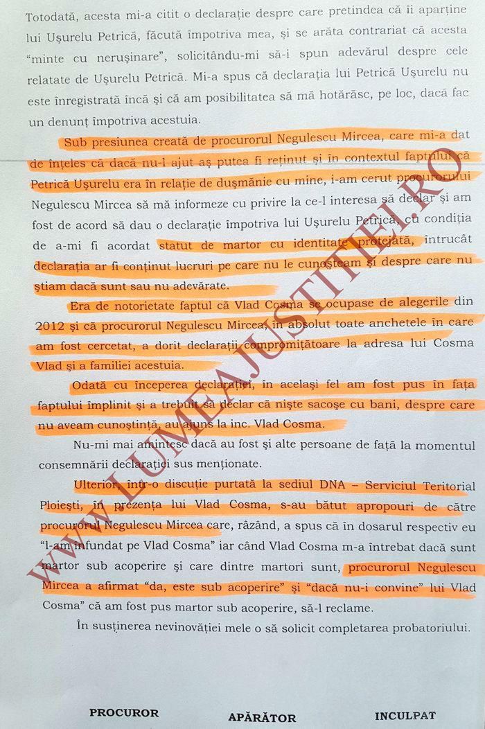 “Referitor la denuntul formulat in cursul anului 2014, arat ca in acea perioada eram arestat la domiciliu si sub presiunea generata de eventualitatea unei noi arestari preventive ale mele, in contetul in care procurorul Mircea Negulescu mi-a spus[…] ca ma poate aresta din nou in alte dosare, mi-a solicitat sa-l ajut cu denunturi […] Sub presiunea creata de procurorul Negulescu, care mi-a dat de inteles ca daca nu-l ajut as putea fi retinut,[ …], i-am cerut procurorului Negulescu sa ma informeze cu privire la ce il interesa sa declar[…]”. “Era de notorietate faptul ca Vlad Cosma se ocupase de alegerile din 2012 si ca procurorul Negulescu Mircea, IN ABSOLUT TOATE ANCHETELE in care am fost cercetat, a dorit declaratii compromitatoare la adresa lui Cosma Vlad si a familiei acestuia. Odata cu inceperea declaratiei in acelasi fel am fost pus in fata faptului implinit si a trebuit sa declar ca niste sacose cu bani despre care nu aveam cunostinta au ajuns la Vlad Cosma.”