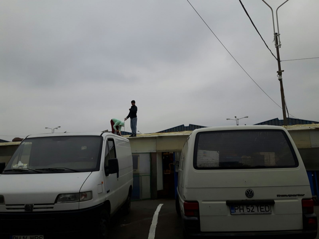 Ca soluție de avarie, având în vedere că vine iarna, acoperișul de la piață este cârpit cu spumă poliuretanica. Mai mulți angajați au fost surprinși astăzi în timp ce încercau să efectueze lucrarea, probabil și ca urmare a sesizărilor ca, la orice ploaie, picăturile de apă se scurg pe tarabele cu fructe.