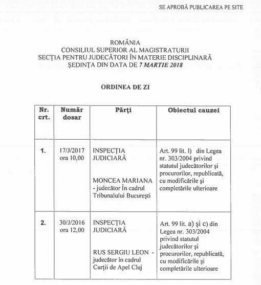 Astazi, miercuri, 7 Martie 2018, Mariana Moncea va fi judecată de Secţia pentru judecători în materie disciplinară a CSM. Este primul punct pe ordinea de zi.