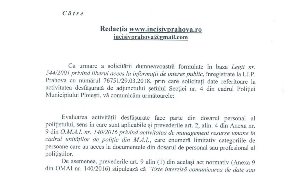 „Normal”, zicem și noi, că asemenea informații „nu sunt publice” întrucât se evidențiază gravele abateri de la Lege ale unui filfizon (și câți ca el nu sunt în M.A.I.) ajuns într-o funcție de conducere prin șpăgi, amenințări, furt etc., așa cum ajung șefi în M.A.I. marea majoritate (din păcate).