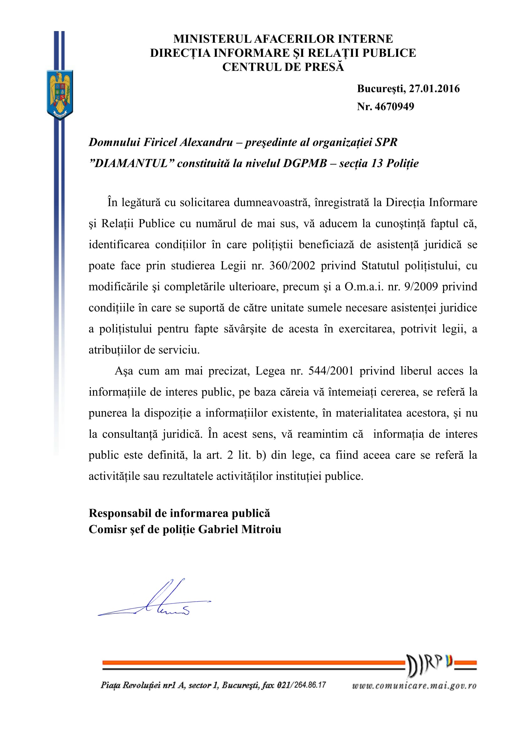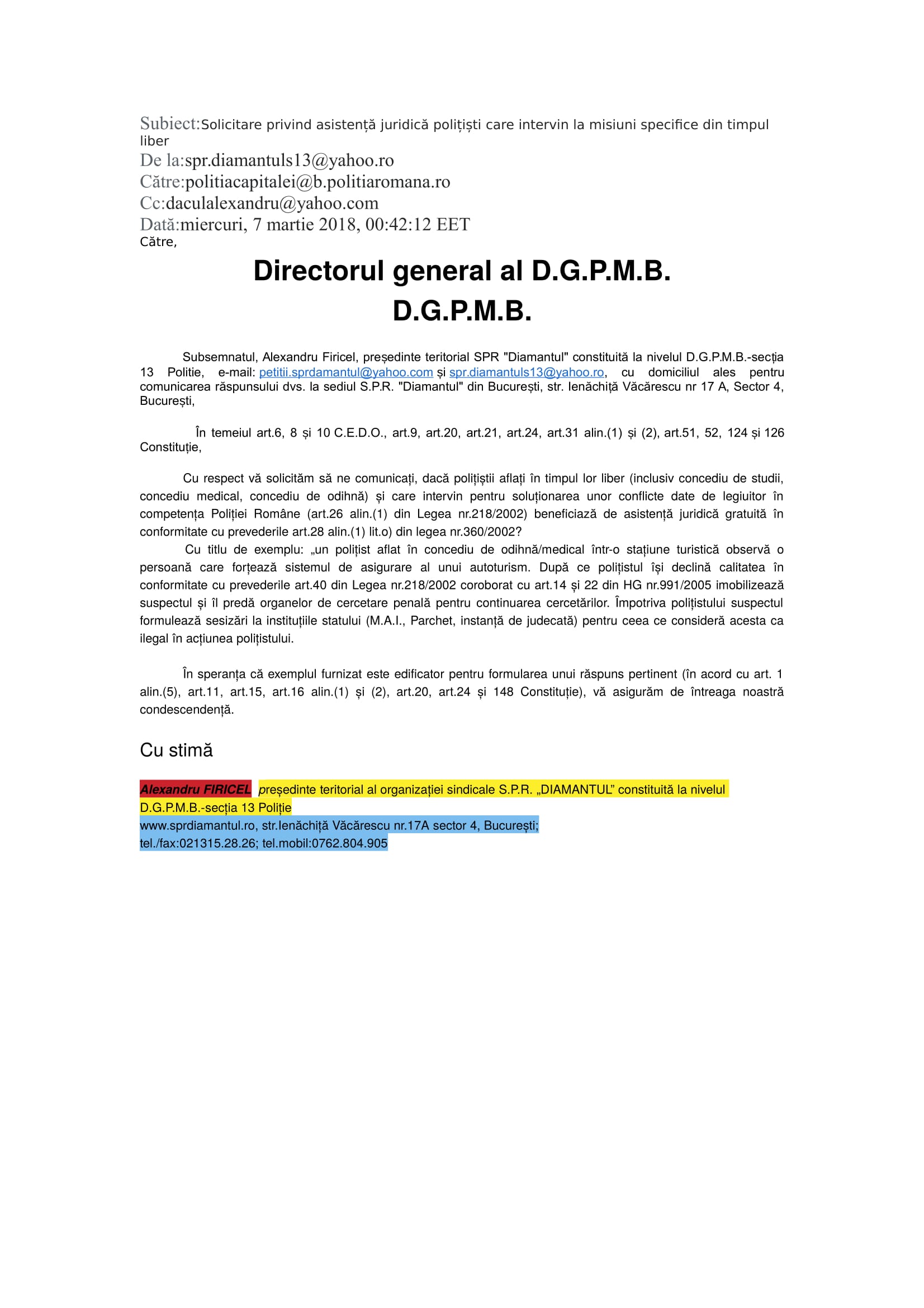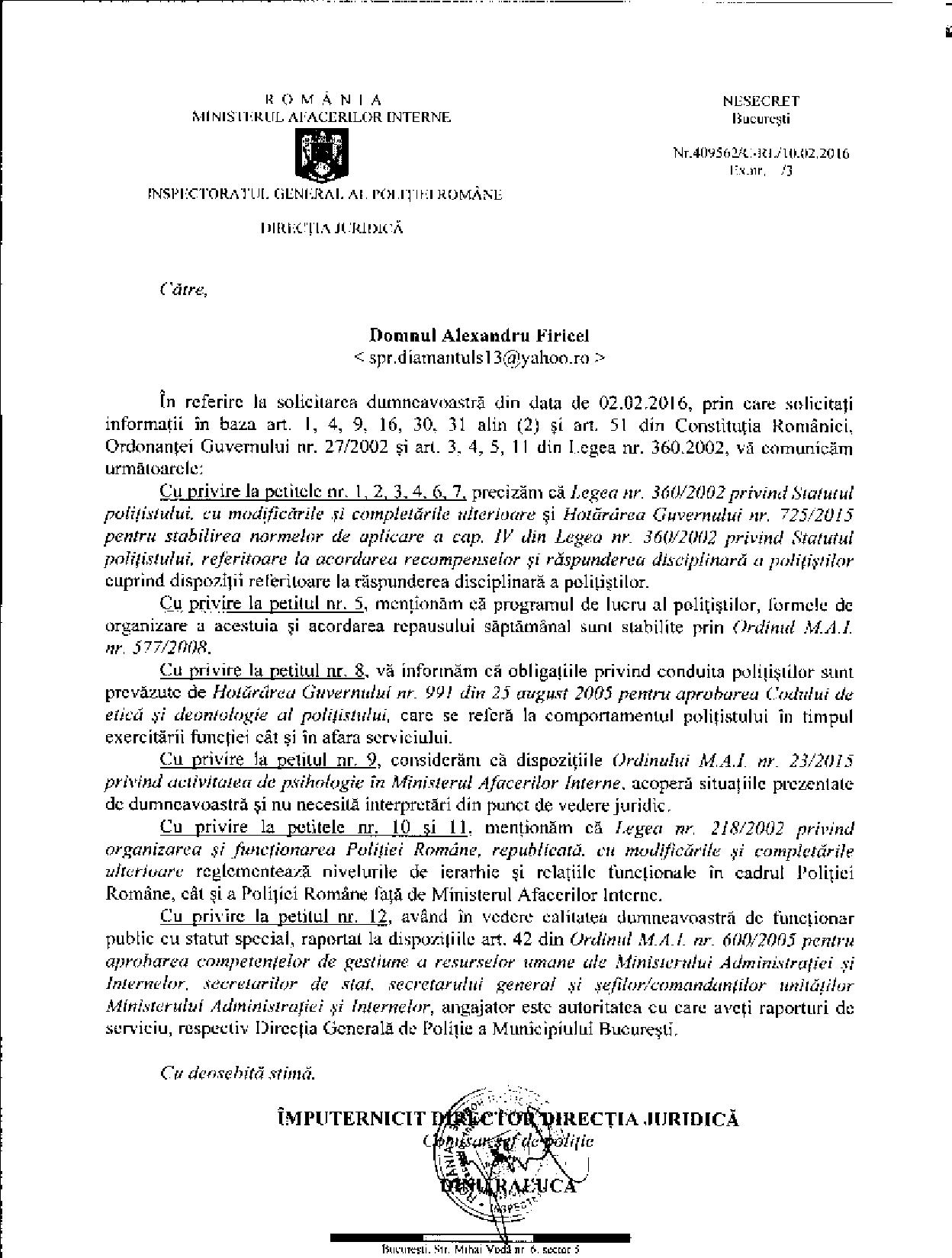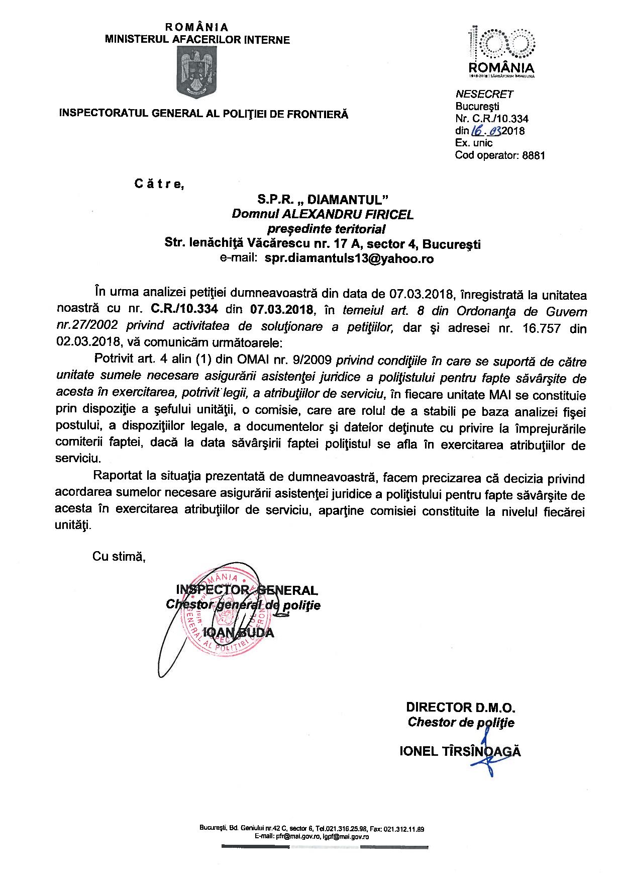 În demersul SPR „Diamantul” privind asistența juridică a polițiștilor „din stradă” respectiv „din frontieră” au fost interpelate: M.A.I., I.G.P.R., I.G.P.F. și D.G.P.M.B. Bineânțeles că M.A.I. și D.G.P.M.B. nu au răspuns fiindcă în aceste două… entități ale statului Român, Convenția EDO, Constituția și Legea sunt simple facultăți („basme de adormit copiii”) nicidecum norme de drept obligatorii, superioare normelor interne. Mai mult, Aparatul central al M.A.I. și D.G.P.M.B. sunt mult-prea ocupate să ascundă în spatele zidurilor acestora dar și sub uniforma de polițist: pedofili și infractori dovediți de instanțele de judecată (precum Constantin Iulian respectiv Stan Eugen – o fi „coincidență de nume” cu fostul adjunct al DGPMB și finul „chestorului-schimbător de viteză” Voicu Marius revenit „la cârma D.G.P.M.B. după ce ministresa Carmencita la „re-popit”, Stan Cristian Ionuț: un laș și un incult căruia îi este frică să semneze înscrisuri oficiale http://stiri.tvr.ro/un-politist-incomod–la-un-pas-de-concediere_72475.html#view (în prezent, șeful Direcției de Crimă Organizată din IGPR) ?