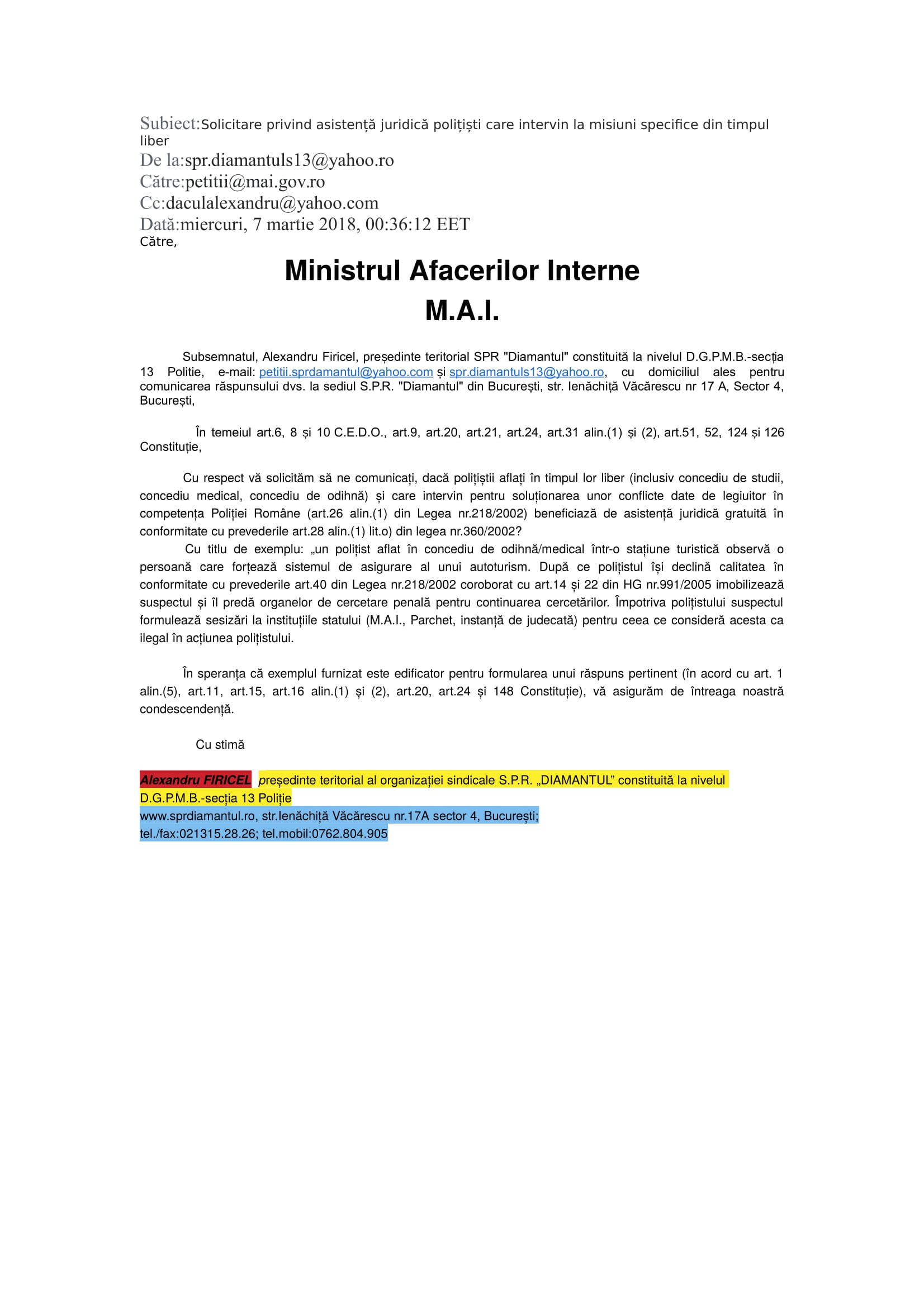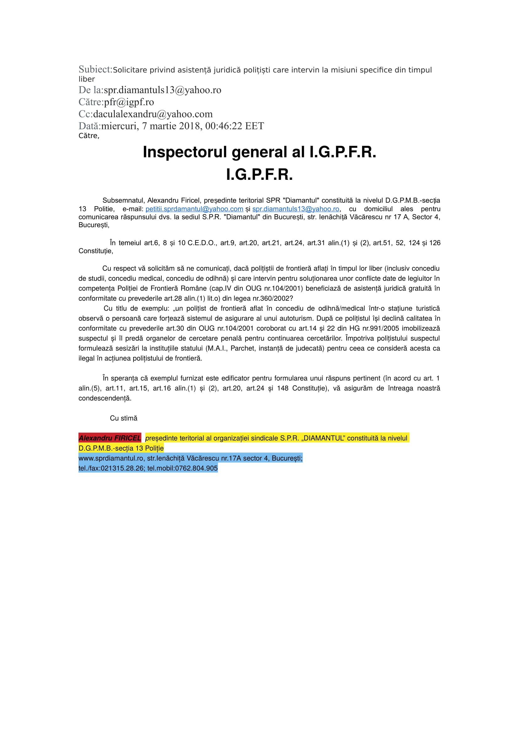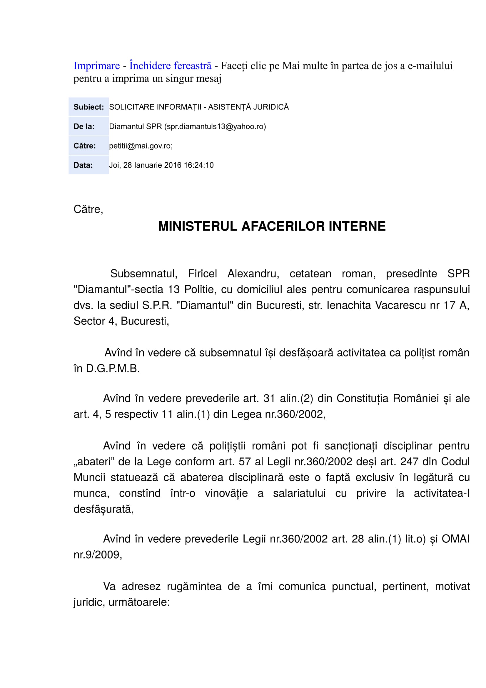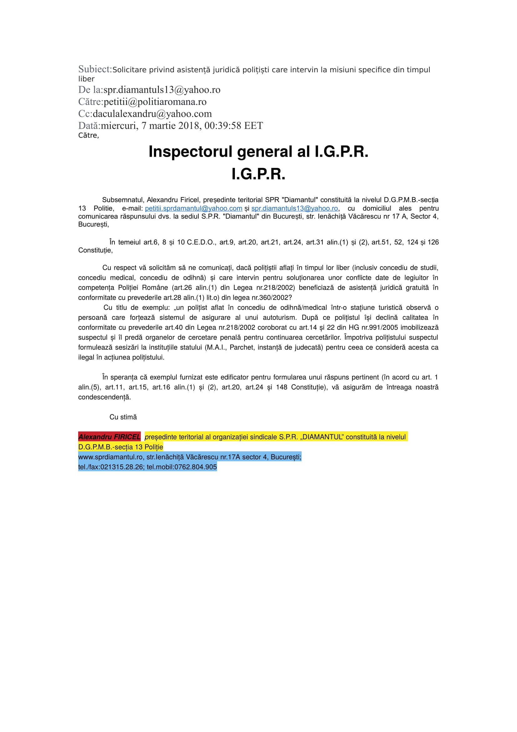 În demersul SPR „Diamantul” privind asistența juridică a polițiștilor „din stradă” respectiv „din frontieră” au fost interpelate: M.A.I., I.G.P.R., I.G.P.F. și D.G.P.M.B. Bineânțeles că M.A.I. și D.G.P.M.B. nu au răspuns fiindcă în aceste două… entități ale statului Român, Convenția EDO, Constituția și Legea sunt simple facultăți („basme de adormit copiii”) nicidecum norme de drept obligatorii, superioare normelor interne. Mai mult, Aparatul central al M.A.I. și D.G.P.M.B. sunt mult-prea ocupate să ascundă în spatele zidurilor acestora dar și sub uniforma de polițist: pedofili și infractori dovediți de instanțele de judecată (precum Constantin Iulian respectiv Stan Eugen – o fi „coincidență de nume” cu fostul adjunct al DGPMB și finul „chestorului-schimbător de viteză” Voicu Marius revenit „la cârma D.G.P.M.B. după ce ministresa Carmencita la „re-popit”, Stan Cristian Ionuț: un laș și un incult căruia îi este frică să semneze înscrisuri oficiale http://stiri.tvr.ro/un-politist-incomod–la-un-pas-de-concediere_72475.html#view (în prezent, șeful Direcției de Crimă Organizată din IGPR) ?