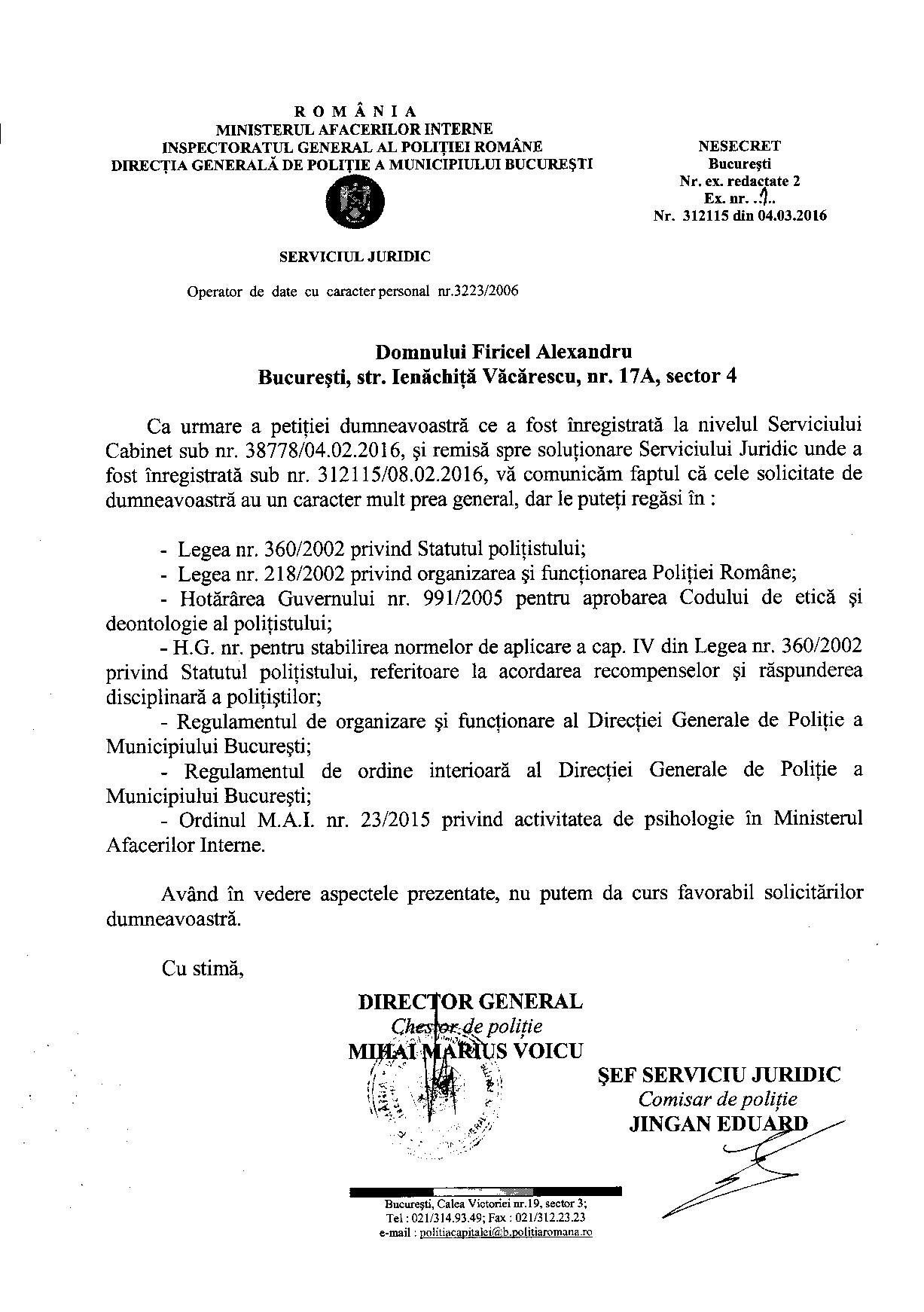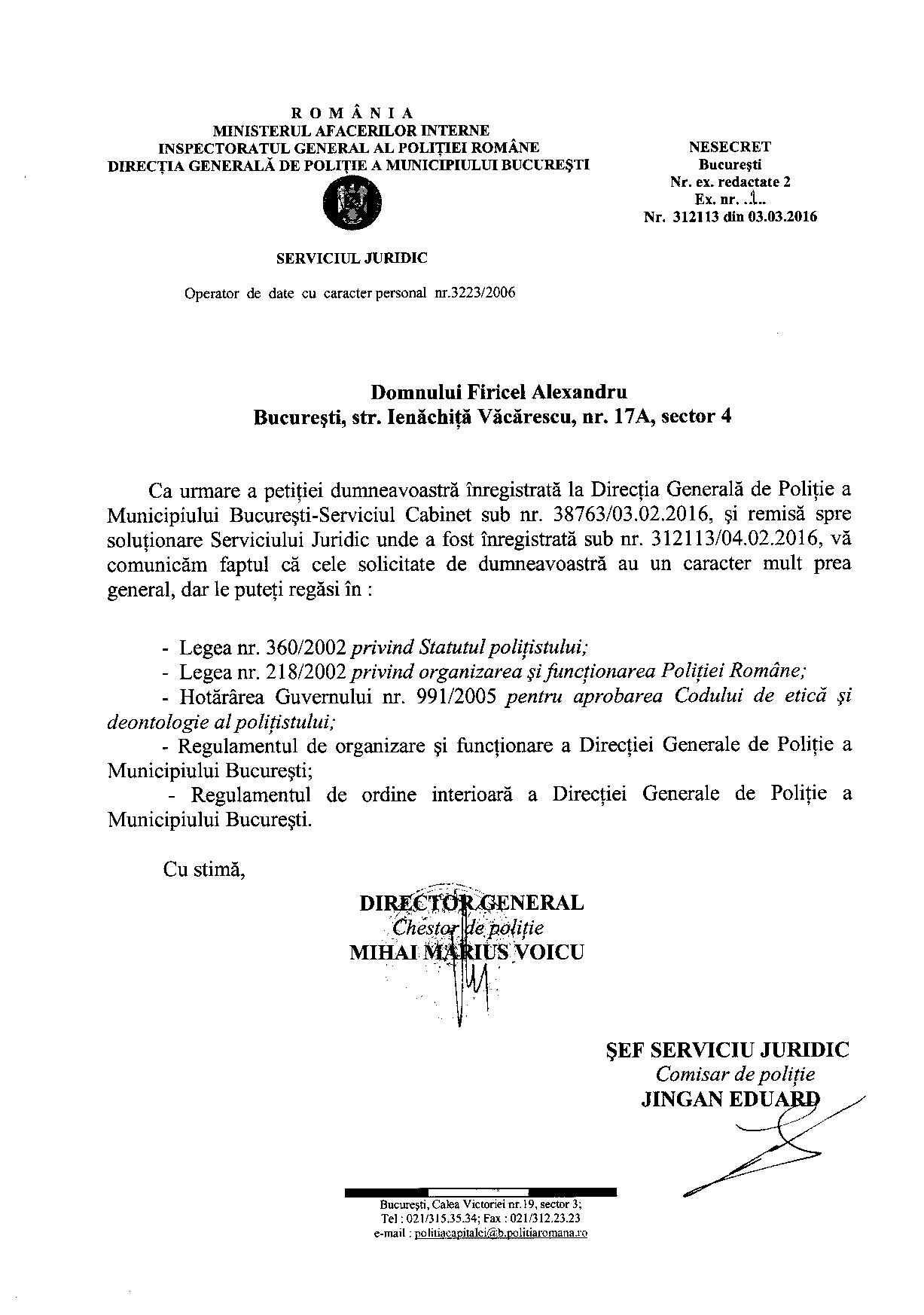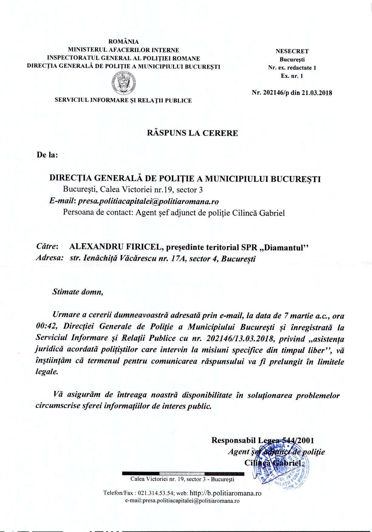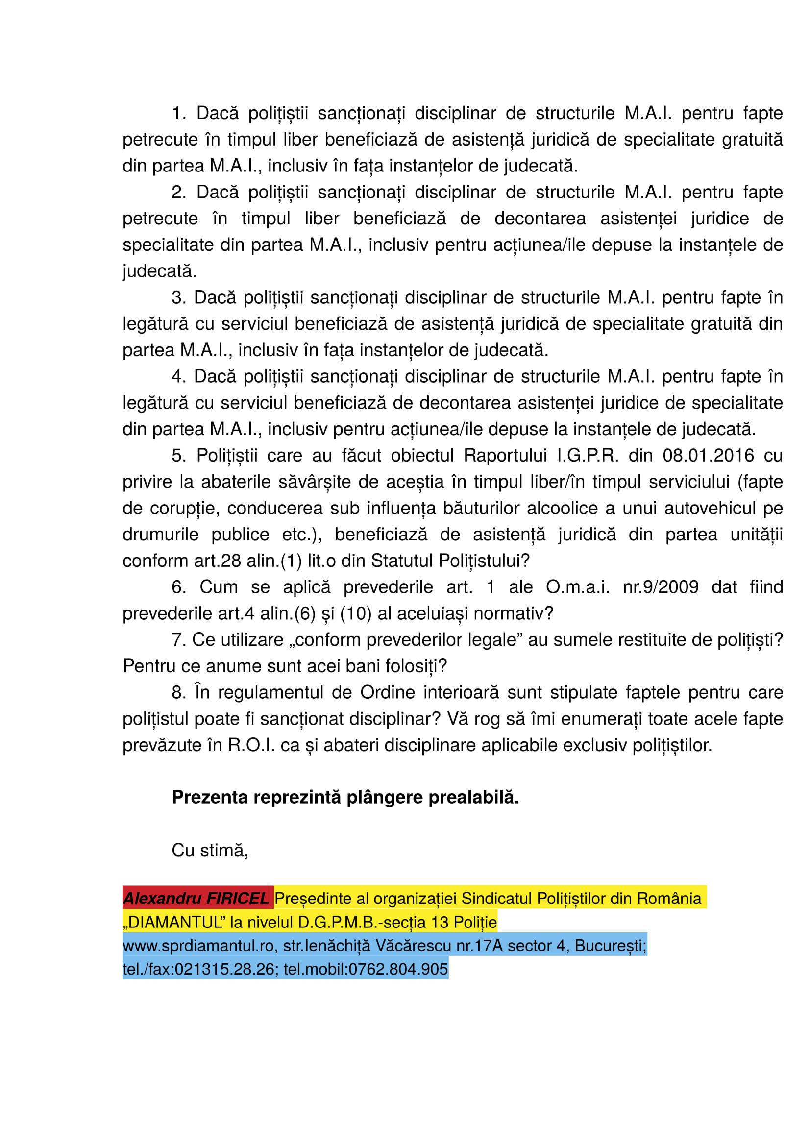 În demersul SPR „Diamantul” privind asistența juridică a polițiștilor „din stradă” respectiv „din frontieră” au fost interpelate: M.A.I., I.G.P.R., I.G.P.F. și D.G.P.M.B. Bineânțeles că M.A.I. și D.G.P.M.B. nu au răspuns fiindcă în aceste două… entități ale statului Român, Convenția EDO, Constituția și Legea sunt simple facultăți („basme de adormit copiii”) nicidecum norme de drept obligatorii, superioare normelor interne. Mai mult, Aparatul central al M.A.I. și D.G.P.M.B. sunt mult-prea ocupate să ascundă în spatele zidurilor acestora dar și sub uniforma de polițist: pedofili și infractori dovediți de instanțele de judecată (precum Constantin Iulian respectiv Stan Eugen – o fi „coincidență de nume” cu fostul adjunct al DGPMB și finul „chestorului-schimbător de viteză” Voicu Marius revenit „la cârma D.G.P.M.B. după ce ministresa Carmencita la „re-popit”, Stan Cristian Ionuț: un laș și un incult căruia îi este frică să semneze înscrisuri oficiale http://stiri.tvr.ro/un-politist-incomod–la-un-pas-de-concediere_72475.html#view (în prezent, șeful Direcției de Crimă Organizată din IGPR) ?