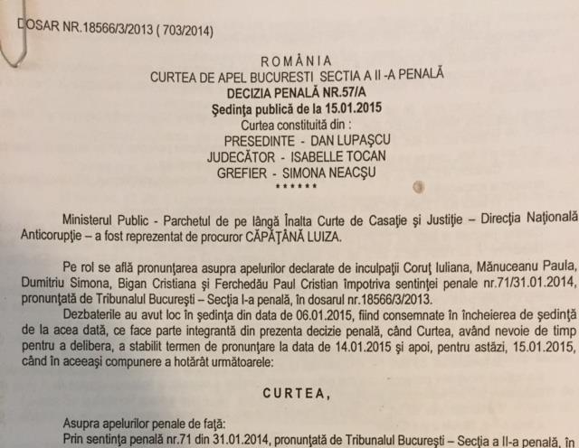 Oare domnul Dan Lupascu isi aminteste, cand era judecator la Curtea de Apel Bucuresti (CAB) Sectia a II a penala, ca intr-un proces penal in dosarul nr.18566/3/2013 (703/2014), a hotarat prin Decizia penala nr.57/A/15.01.2015, in calitate de presedinte de complet alturi de dna judecator Isabelle Tocan, fara probe concrete ci doar in baza unor probe rezultate din punerea in exploatare a unui mandat pe siguranta nationala nr.006106/19.10.2012, emis de ICCJ pentru autorizarea interceptarii si inregistrarii comunicatiilor si convorbirilor electronice ale unui persoane tinta, respectiv ale proceselor verbale de transcriere a discutiilor telefonice purtate de cei incriminati in baza mandatului mentionat.?