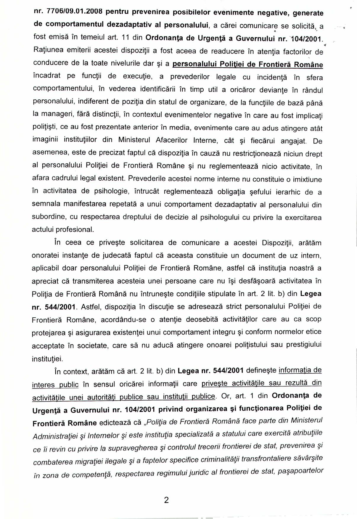 IGPFR-ul zice că: „Astfel, am supus atentiei solicitantului faptul ca, potrivit dispozitiilor art. 11 din Ordonanta de Urgenta a Guvernului nr. 104/2001 privind organizarea și functionarea Politiei de Frontiera Romans „in aplicarea legii inspectorul general emite dispozitii obligatorii pentru lntregul personal din subordine […], dispozitii privind Indeplinirea atributiilor specifice”. Deci, așa cum v-am arătat mai sus, IGPFR-ul nu are atribuții în domeniul psihologiei (doar Colegiul Psihologilor din România are aceste atribuții, conform Legii nr.213/2004 și HG nr.788/2005) ci pentru paza și protecția frontierelor de apă, aeriene și uscat ale României ș.a.m.d. (cap.IV din OUG nr.104/2001). Păi, e la mintea cocoșului că „adormiții” din birourile PFR se trezesc cu idei și, ca să nu zică Lumea că nu fac nimic 8h/zi la birou, „mai emit câte-o dispoziție”… Așa, „de amorul artei”… ce dacă însuși art. 11 din OUG nr.104/2001 invocat de „persoana fizică” Buda Ioan și Legea nr.24/2000 instituie clar că normele infralegale se emit strict în baza dispozițiilor Legii care le ordonă nicidecum „să ne aflăm în treabă”… În M.A.I. și P.F.R. „dăm dispoziții pe bandă rulantă, fără număr”… las’ să fie acolo… s-o avem… că nu se știe… ce dacă e ilegală?