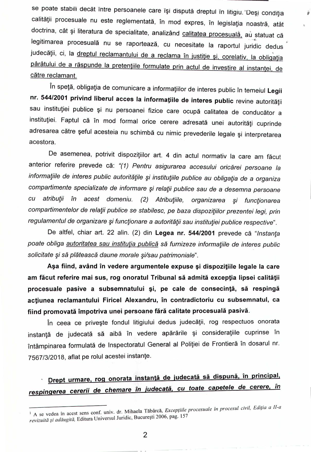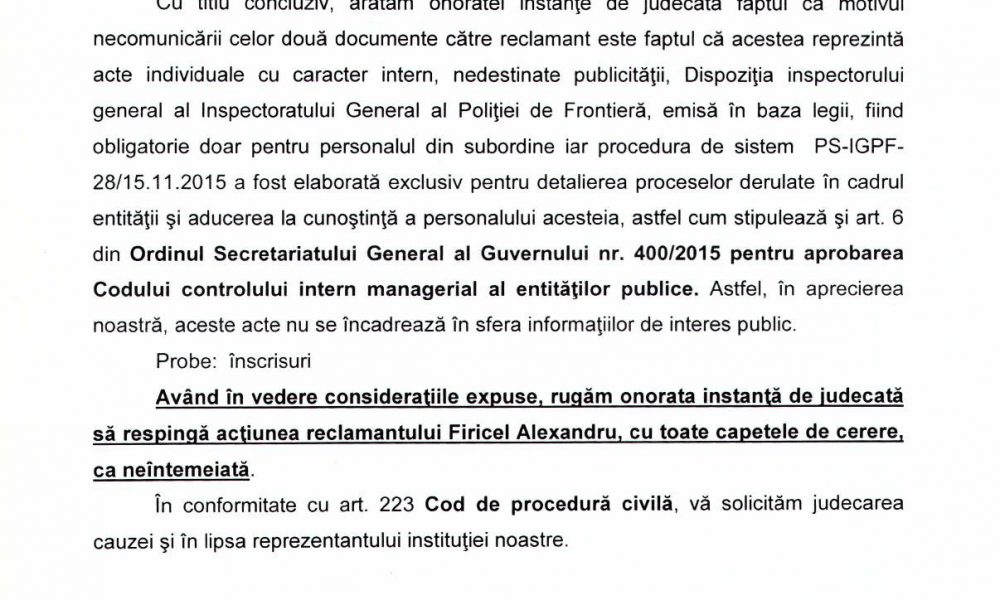 La data de 14 februarie 2018, vă prezentam un demers legitim pentru combaterea/evidențierea unor abuzuri și ilegalități din P.F.R. (model): https://www.incisivdeprahova.ro/2018/03/05/exclusivdemers-adresat-exclusiv-politistilor-de-frontiera-care-nu-se-consideranu-sunt-sluga-sefului-sisau-cobaiul-falsilor-psihologi-m/, tocmai pentru ca angajații profesioniști și onești din Poliția de Frontieră Română să își poată desfășura atribuțiile de serviciu nicidecum să fie obstrucționați de „iluminații cu gulere albe din birourile structurilor de suport”. Ei bine, urmare acestui demers, avem noi dovezi că Poliția de Frontieră Română este, în continuare, condusă în baza dispozițiilor ilegale pe care Buda Ioan, în fața instanțelor de judecată, nu și le mai asumă… doar în fața subordonaților e „mare jmecher”: „În speta, obligatia de comunicare a informatiilor de interes public in temeiul Legii nr. 544/2001 privind liberul acces la informatiile de interes public revine autoritatii sau institutiei publice si nu persoanei fizice care ocupa calitatea de conducator a institutiei. Faptul ca in mod formal orice cerere adresata unei autoritate cuprinde adresarea catre seful acesteia nu schimba cu nimic prevederile legale și interpretarea acestora. […] Așa fiind, avand in vedere argumentele expuse și dispozitiile legale la care am facut referire mai sus, rog onoratul Tribunal sa admita exceptia lipsei calitatii procesuale pasive a subsemnatului […]” Păi bine, dom’ Buda, dumneata primești leafă de „manager-polițist de frontieră” pentru atribuții de persoană fizică („pe persoană fizică care este” – ex-primarul Sectorului 5, Marean Vanghelie)? După ce ai emis: dispoziție și procedură (pe care ai refuzat, alături de subalternii tăi „iluminați” să le depuneți la dosarul cauzei odată cu întâmpinarea (încălcarea regulilor procesuale instituite de Codul de Procedură Civilă, pentru a face dovada existenței lor) susții că „nu ai treabă cu această cauză”? Ți-a fugit curajul, dom’ Buda, când ai văzut cererea de chemare la judecată? Tocmai ție, care „ai prins en’șpe mii de infractori” din biroul tău călduț din I.G.P.F.R. să „îți fugă curajul”? Sau ai remarcat că Legea psihologului nr.213/2004 și Normele de aplicare a acesteia prevăd că psihologul este independent în exercitarea profesiei, singura autoritate care are dreptul de a emite norme în această activitate/cu privire la profesia de psihologie fiind Colegiul Psihologilor din România nicidecum „dumneata în calitatea-ți de persoană fizică”? Nu e o rușine să nu ști să citești și să înțelegi Legea, Buda Ioan (și voi „polițiștii de birou de frontieră” care ați redactat cele două întâmpinări,  ci e o rușine să încalci Legea, din calitatea ta oficială de agent al statului „persoană fizică Buda Ioan” (și „redactorii” celor 2 întâmpinări)!