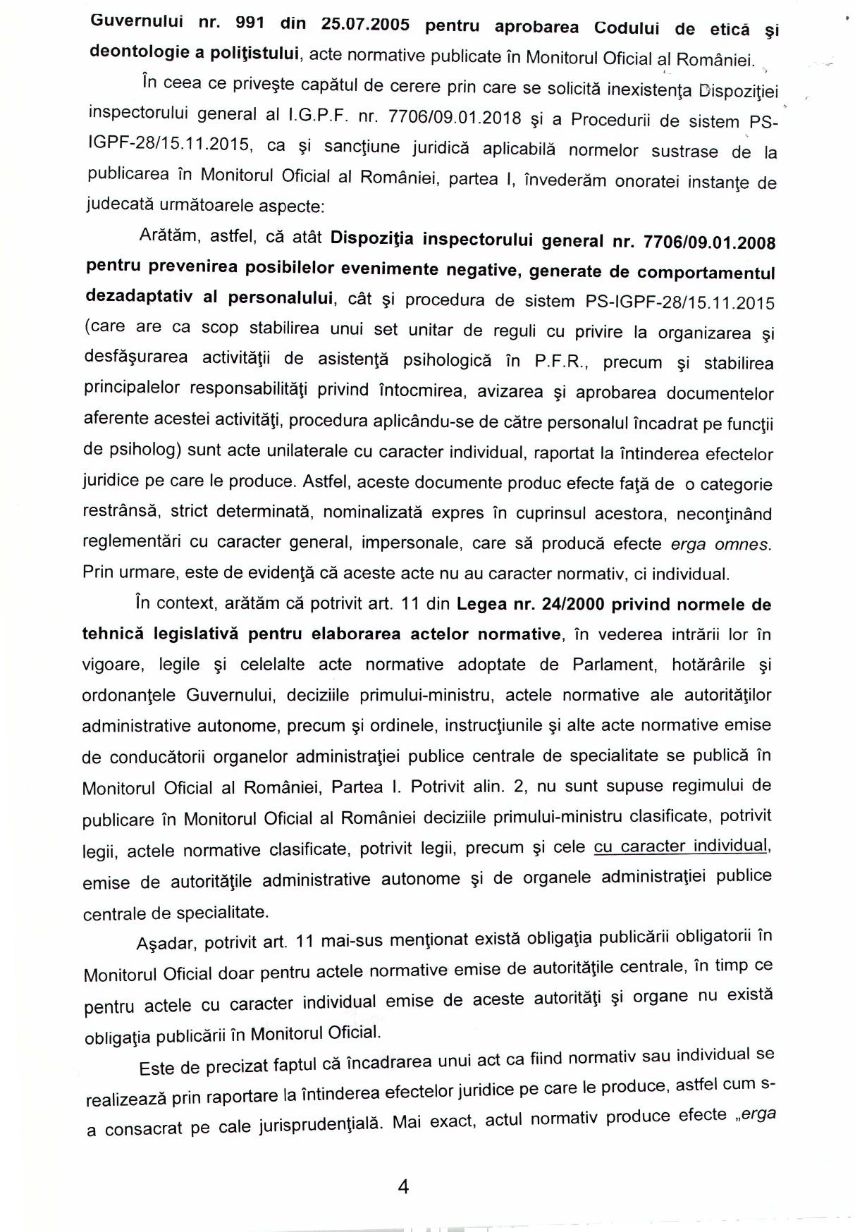 Iar „cireașa de pe tort” ne-o arată tot „persoana fizică” Buda Ioan: mai întâi susține acesta că dispoziția și procedura „sunt acte administrative normative interne, obligatorii, aplicabile întregului personal al P.F.R.”, apoi (la fila 4 a întâmpinării IGPFR), susține că sunt acte administrative cu caracter unilateral… Măi, dom’ Buda („persoană fizică”), pe dumneata cine te-a testat „la cap”? Dar pe ăla/ăia care au redactat „minunea asta juridică” (întâmpinarea nr.S3/669180/03.04.2018, cine i-a testat „la cap”? Ia uite, „stimată persoană fizică” Buda Ioan ce zice Legea contenciosului administrativ nr.554/2004 la articolul nr.2 lit.c) și art. 4: că actele administrative unilaterale sunt distincte de actele administrative cu caracter normativ… iar legiuitorul a instituit pentru fiecare act (administrativ-normativ respectiv unilateral) în parte, reguli distincte de cercetare și  sancționare din partea instanței de judecată, în acord cu art. 1.326 Cod Civil[4]