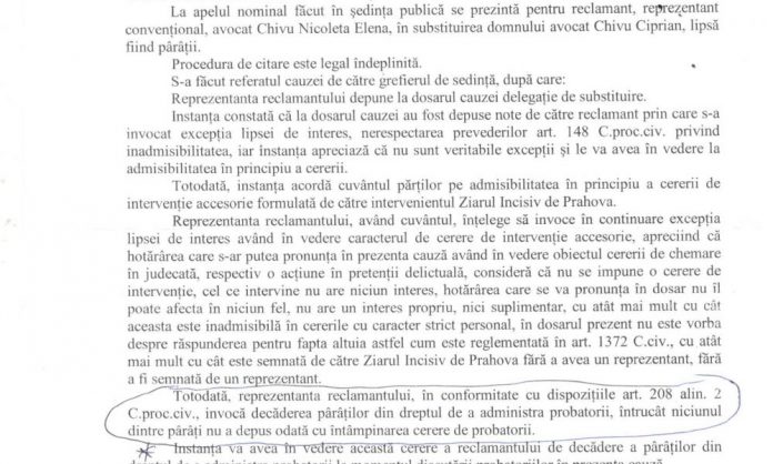 Această d-nă „avocat” stagiar Chivu Nicoleta Elena ori s-a prezentat în fața instanței precum „musca la arat” (fără să cunoască piesele dosarului) ori, mai grav, face tot posibilul ca reclamantul să nu fie deferit Parchetului pentru a-l cerceta pentru fapte penale extrem de grave precum: uzurpare de calități oficiale (s-a prezentat ca adjunct al șefului secției 4 Poliție-Ploiești fără a-și dovedi această calitate prin depunerea la dosarul cauzei a actului de numire în funcție, trafic de influență, dare de mită, favorizarea infractorului, comportare abuzivă, exces de putere etc.) căci pârâții au formulat și depus întâmpinări în termenul instituit de instanța de judecată, prin Serviciul de Poșta Română împreună cu cererile de probatorii, interogatoriul și probele pe care pârâții le dețineau la acea dată, în conformitate cu art.201[2] și 205[3] CPC.