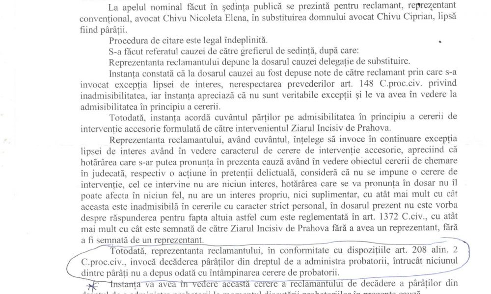 În încheierea de ședință din 16.03.2018, a fost consemnat de instanța de judecată că avocat stagiar Chivu Nicoleta Elena (CUI 38613347), aflată în prezenta cauză în substituirea reprezentantului reclamantului (avocatul Chivu Ciprian) a susținut, că: „Totodată, reprezentanta reclamantului, în conformitate cu dispozițiile art.208 alin.(2)[1], invocă decăderea pârâților din dreptul de a administra probatorii, întrucât niciunul dintre pârâți nu a depus odată cu întâmpinarea cerere de probatorii”.
