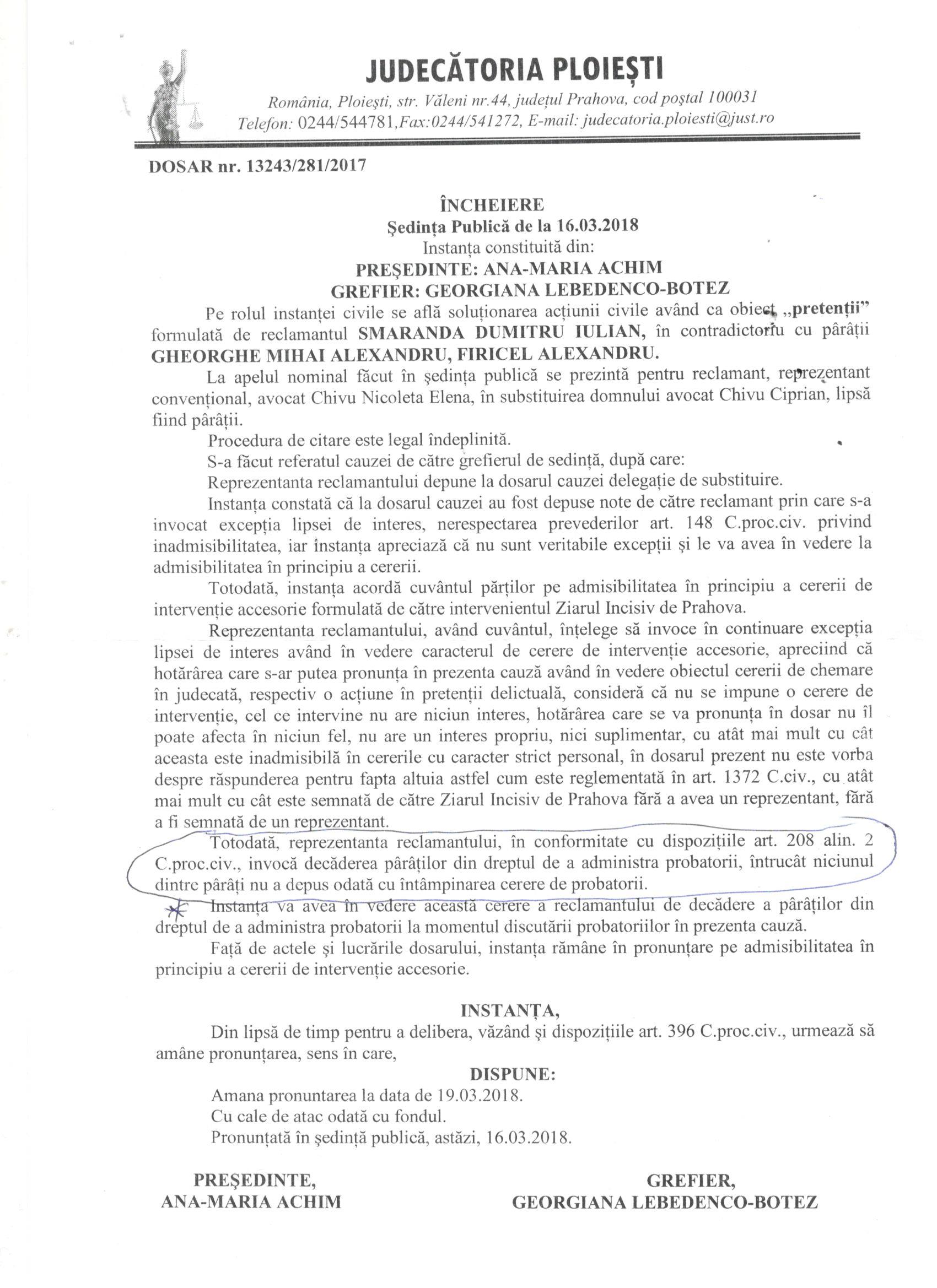 În încheierea de ședință din 16.03.2018, a fost consemnat de instanța de judecată că avocat stagiar Chivu Nicoleta Elena (CUI 38613347), aflată în prezenta cauză în substituirea reprezentantului reclamantului (avocatul Chivu Ciprian) a susținut, că: „Totodată, reprezentanta reclamantului, în conformitate cu dispozițiile art.208 alin.(2)[1], invocă decăderea pârâților din dreptul de a administra probatorii, întrucât niciunul dintre pârâți nu a depus odată cu întâmpinarea cerere de probatorii”.