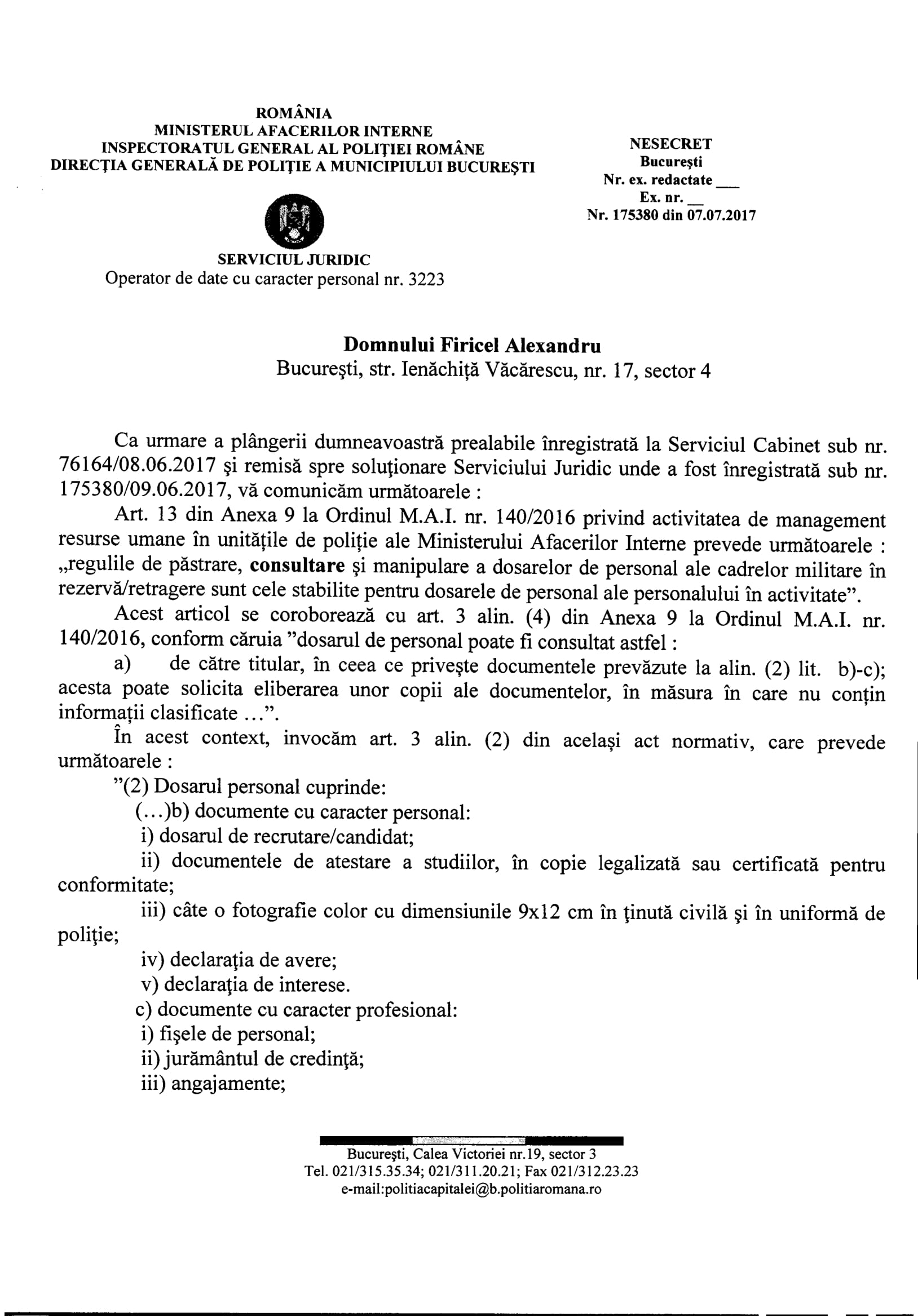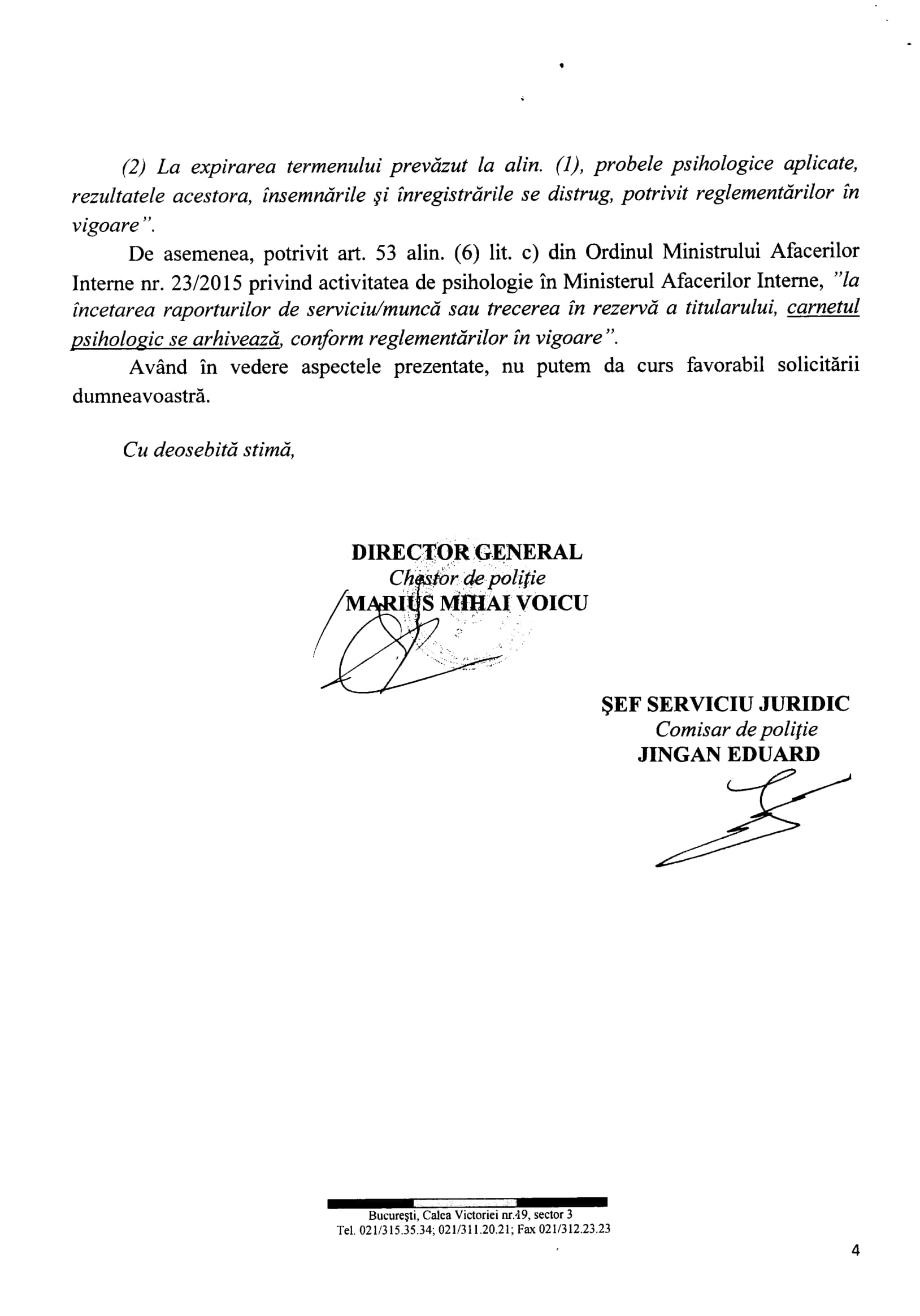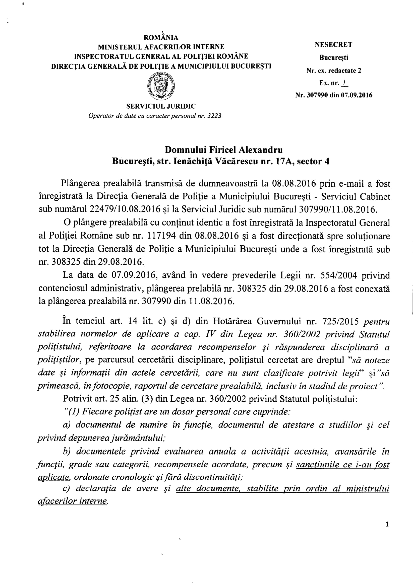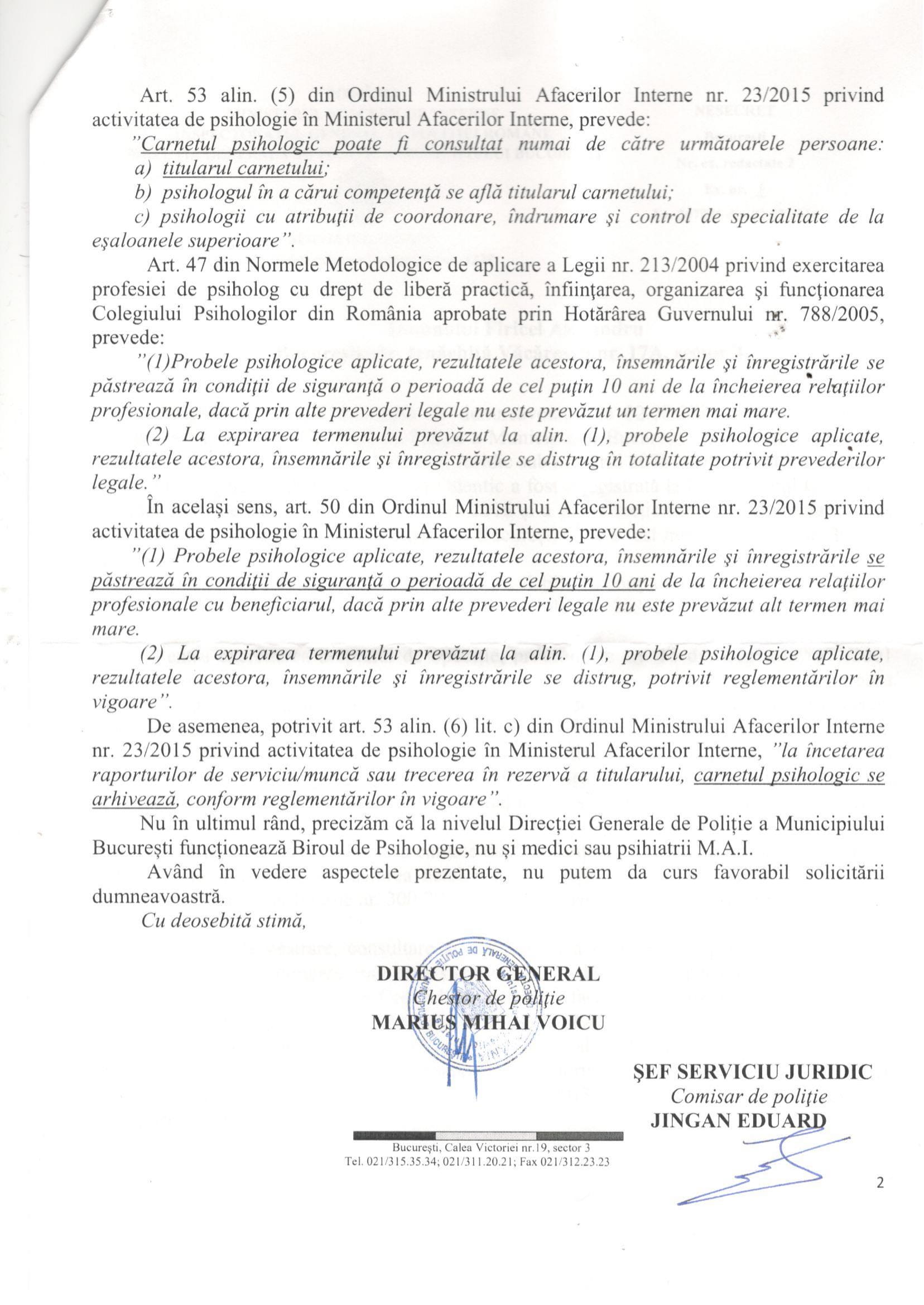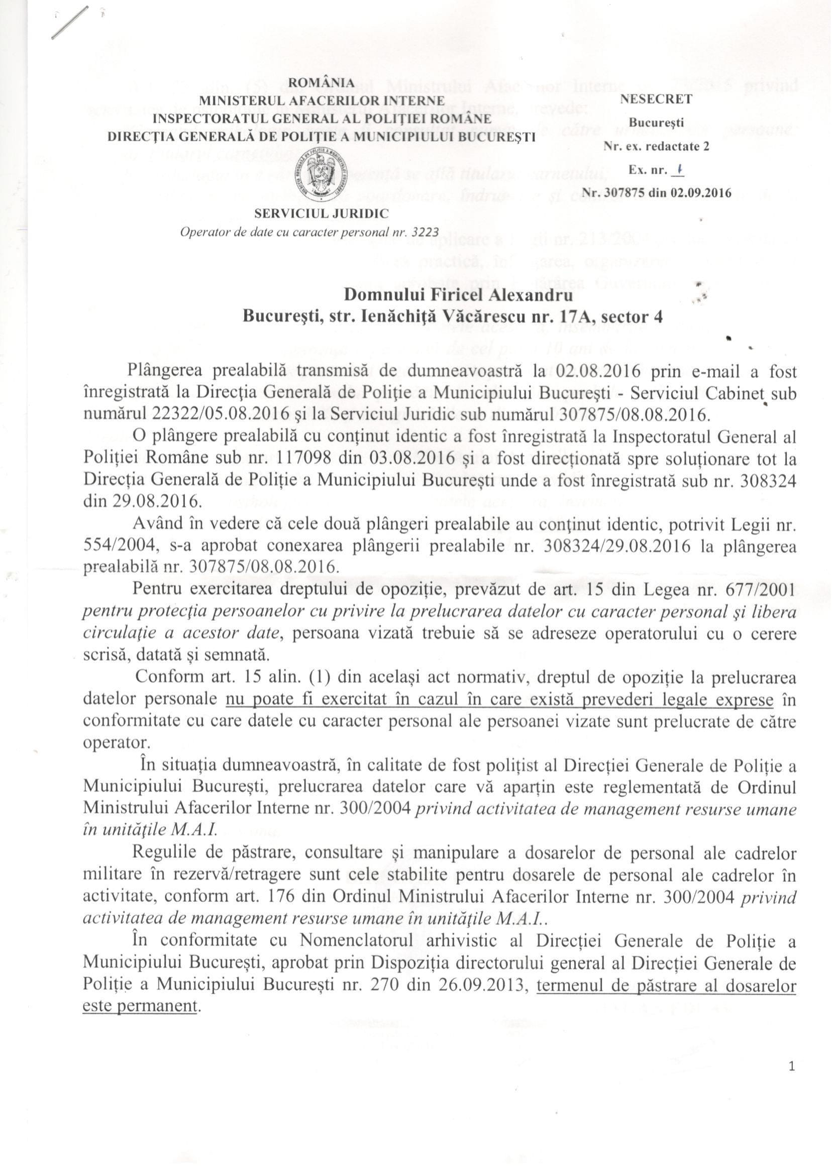 În anul 2016 Voicu Marius și DGPMB ne spun, prin adresele nr.307990 din 07.09.2016 și 307875 din 02.09.2016 că datele cu caracter personal ale persoanelor sunt în continuare prelucrate în baza Ordinului M.A.I. nr.300/2004. Așadar, la aproape un an de la publicarea în Monitorul Oficial a Decizie nr.637/2015, DGPMB încă uzita OMAI nr.300/2004 pentru a prelucra date cu caracter personal prin eludarea Legii nr.677/2001 și a Legii nr.638/2009. Ce contează că: Legea nr.677/2001 și Legea nr.238/2009 îi permite Poliției să prelucreze date cu caracter personal numai în anumite condiții? ÎN M.A.I. ȘI POLIȚIE ORDINUL DE MINISTRU „E MAI TARE” DECÂT CURTEA CONSTITUȚIONALĂ, LEGEA!