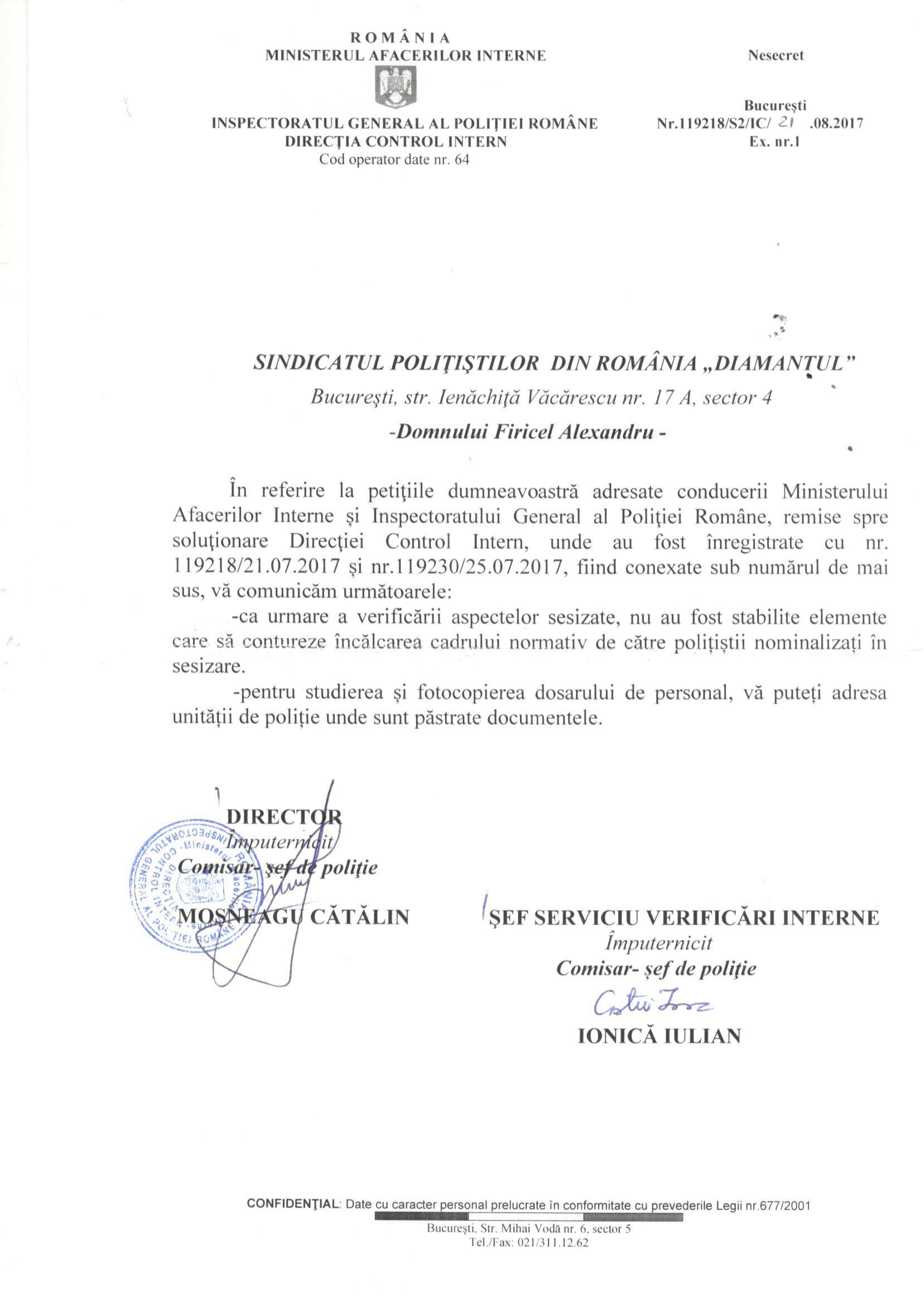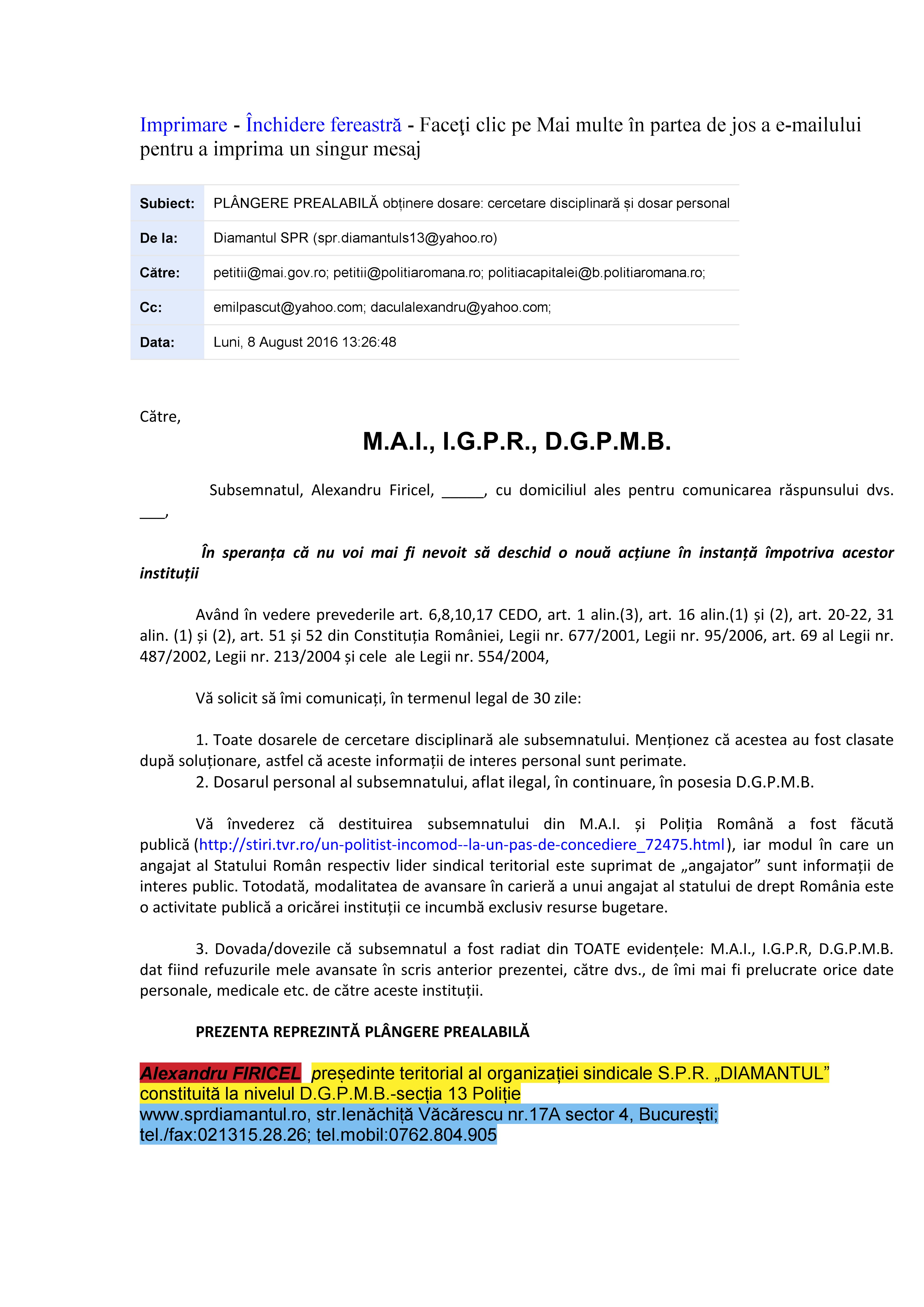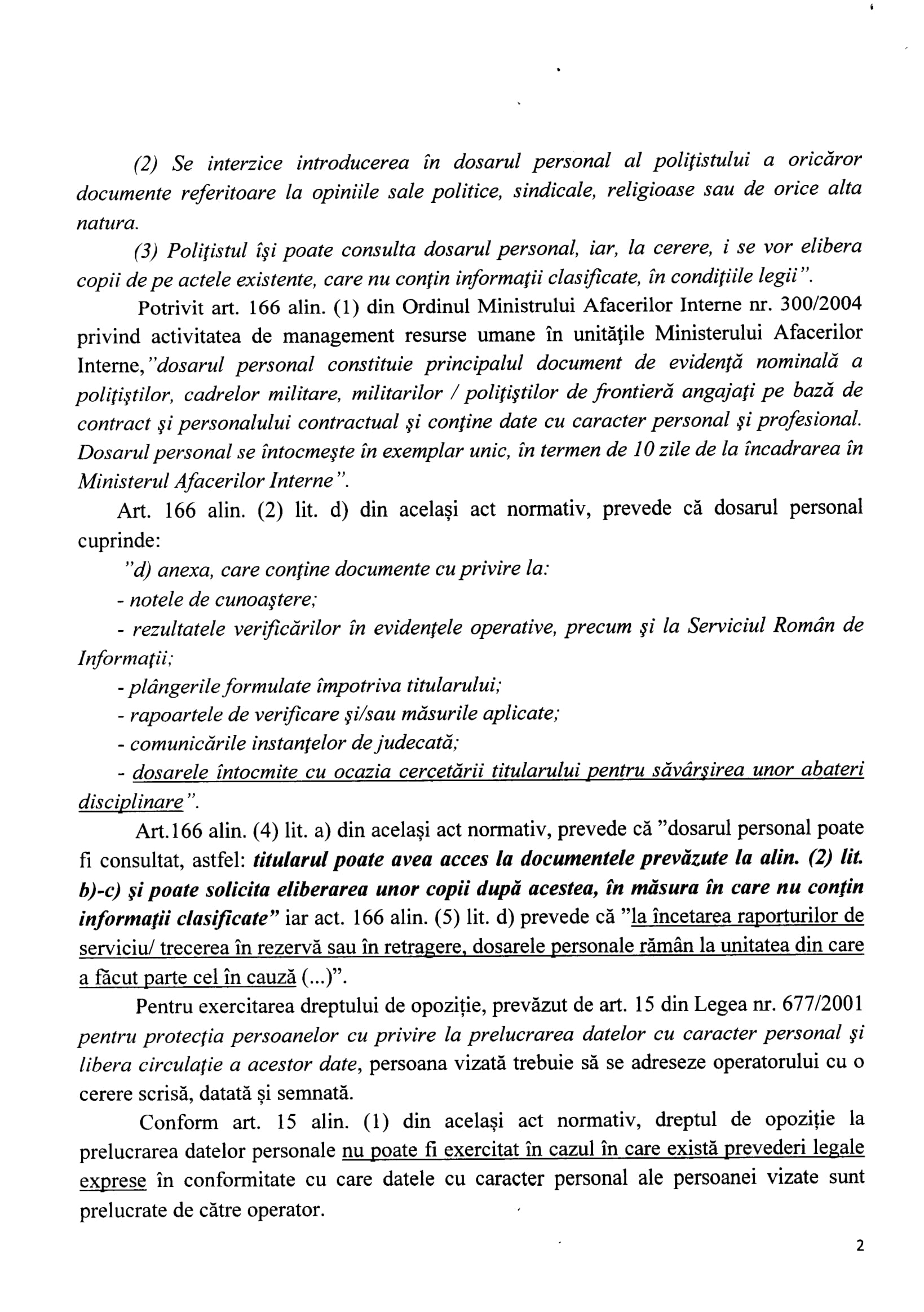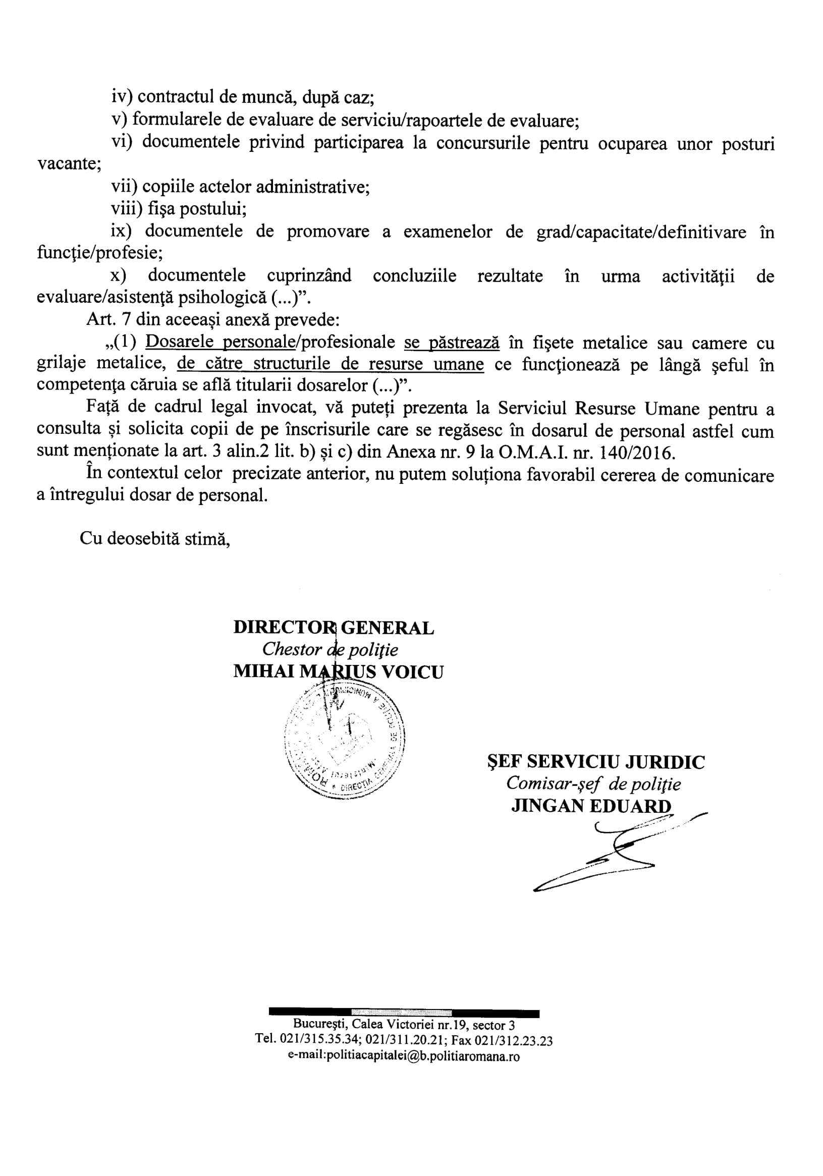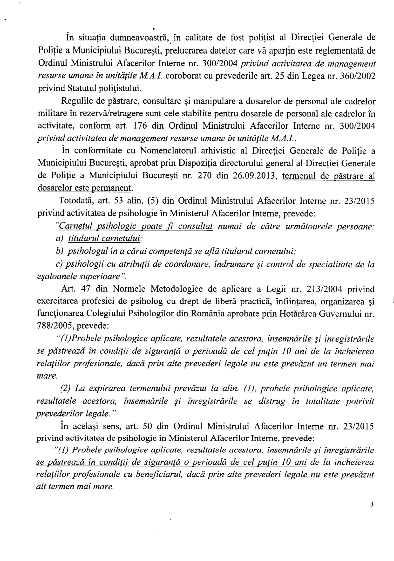 În anul 2016 Voicu Marius și DGPMB ne spun, prin adresele nr.307990 din 07.09.2016 și 307875 din 02.09.2016 că datele cu caracter personal ale persoanelor sunt în continuare prelucrate în baza Ordinului M.A.I. nr.300/2004. Așadar, la aproape un an de la publicarea în Monitorul Oficial a Decizie nr.637/2015, DGPMB încă uzita OMAI nr.300/2004 pentru a prelucra date cu caracter personal prin eludarea Legii nr.677/2001 și a Legii nr.638/2009. Ce contează că: Legea nr.677/2001 și Legea nr.238/2009 îi permite Poliției să prelucreze date cu caracter personal numai în anumite condiții? ÎN M.A.I. ȘI POLIȚIE ORDINUL DE MINISTRU „E MAI TARE” DECÂT CURTEA CONSTITUȚIONALĂ, LEGEA!