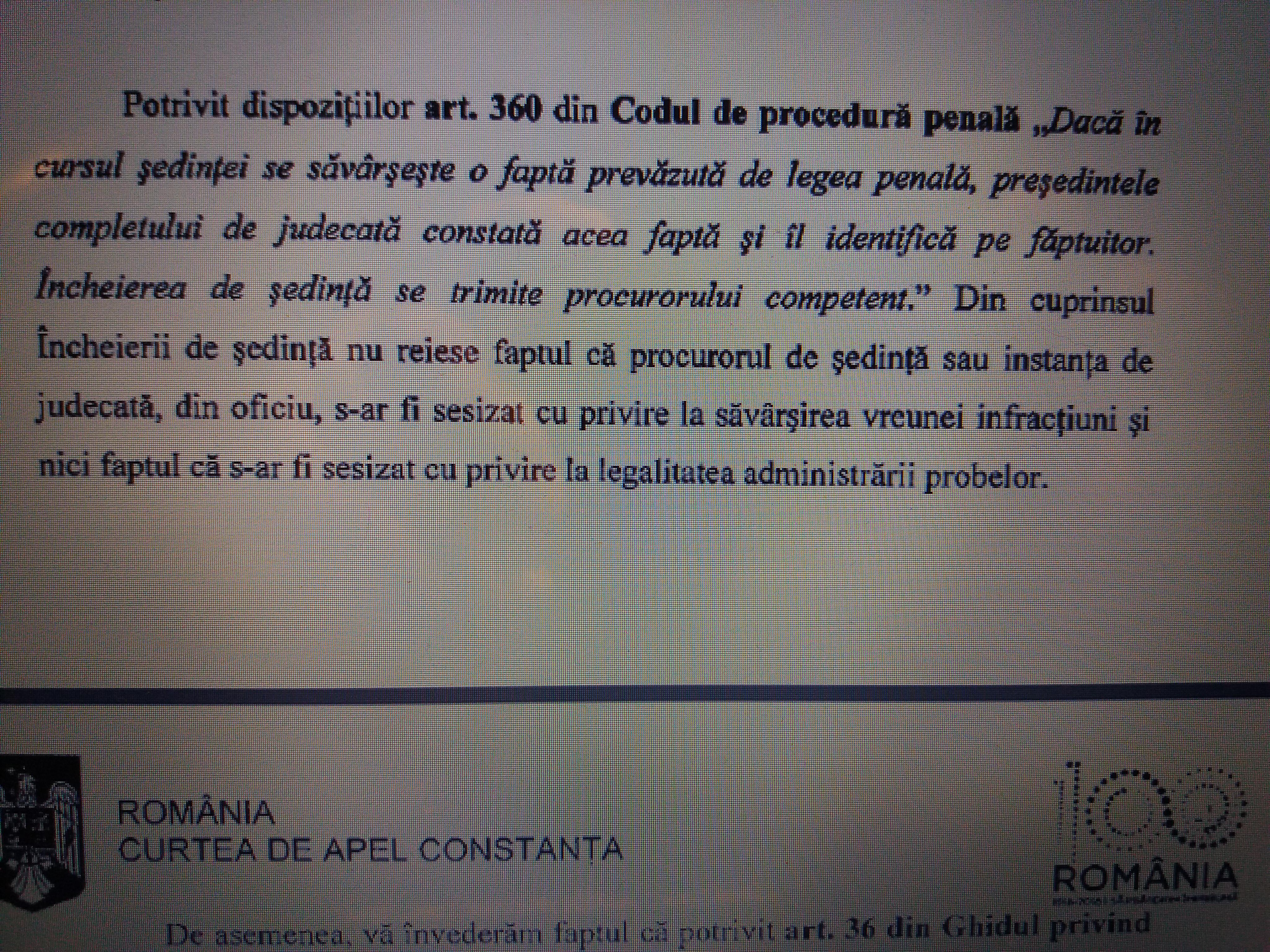 In aceste conditii, avand in vedere raspunsul Curtii de Apel Constanta si considerand ca exista elementele constitutive ale savarsirii unor infractiuni dar si a unor abateri disciplinare pentru musamalizarea celor care au fabricat probe in urmarirea penala, Incisiv de Prahova va formula și va depune, în temeiul art. 97 din Legea nr. 303/2004, sesizare prin care o sa solicitam inițierea unei proceduri judiciare împotriva doamnei procuror de sedinta din dosarul 23071/212/2016 de pe rolul Curtii de Apel Constanta pentru săvârșirea abaterilor disciplinare prev. de art. 99 lit. s) teza a II – a și lit. t) teza I din Legea nr. 303/3004 privind statutul judecătorilor și procurorilor, republicată și cu modificările ulterioare. (Ec Adrian Radu).