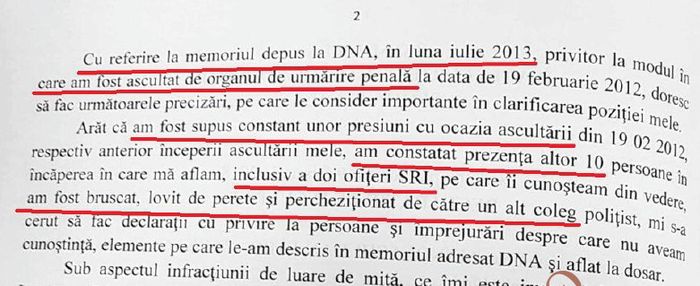 Arat ca am fost supus constant unor presiuni cu ocazia ascultarii din 19.02.2012, respectiv anterior inceperii ascultarii mele, am constatat prezenta altor 10 persoane in incaperea in care ma aflam, inclusiv a doi ofiteri SRI, pe care ii cunosteam din vedere, am fost bruscat , lovit de perete si perchezitionat de catre un alt coleg politist, mi s-a cerut sa fac declaratii cu privire la persoane si imprejurari despre care nu aveam cunostinta, elemente pe care le-am descris in memoriul adresat DNA si aflat in dosar (…)