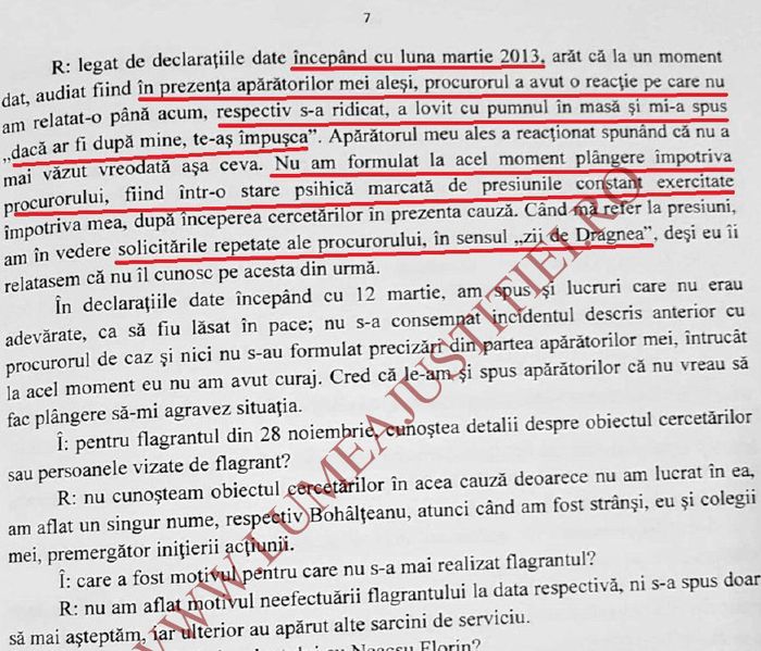 …Legat de declaratiile date, incepand cu luna martie 2013, arat ca la un moment dat, audiat fiind in prezenta aparatorilor mei alesi, procurorul (n.n. – Marin Nicolae) a avut o reactie pe care nu am relatat-o pana acum, respectiv s-a ridicat, a lovit cu pumnul in masa si mi-a spus: ‘DACA AR FI DUPA MINE, TE-AS IMPUSCA!’ Aparatorul meu ales a reactionat spunand ca nu a mai vazut niciodata asa ceva. Nu am formulat la acesl moment plangere impotriva procurorului, fiind intr-o stare psihica marcata de presiunile constant exercitate impotriva mea, dupa inceperea cercetarilor in prezenta cauza. Cand ma refer la presiuni, am in vedere solicitarile repetate ale procurorului, in sensul: ‘ZII DE DRAGNEA‘, desi eu ii relatasem ca nu il cunosc pe acesta din urma. (…)