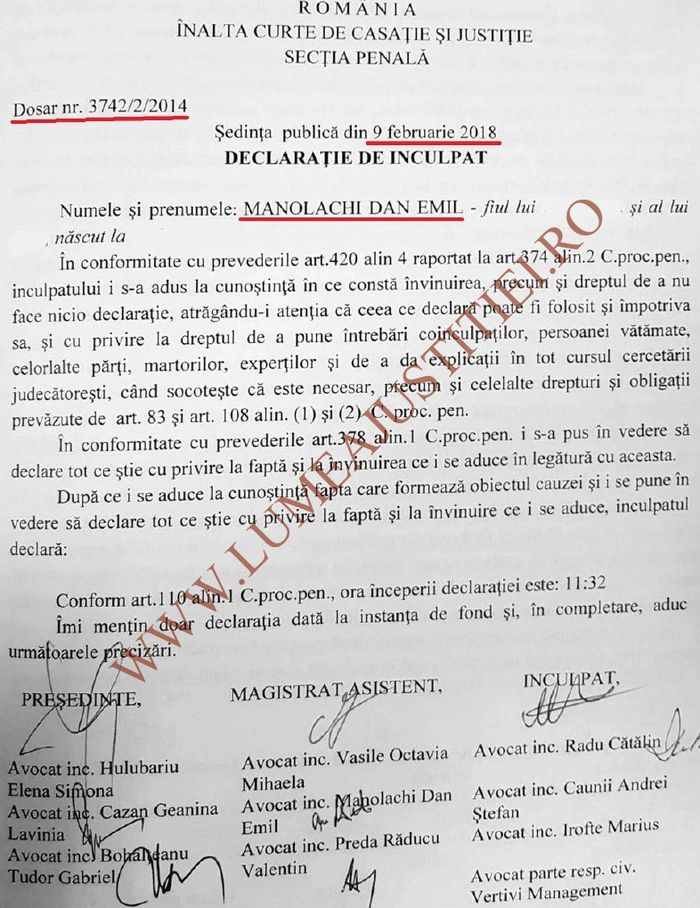 Lumeajustitiei.ro va prezinta in continuare o declaratie incendiara data in fata ICCJ de fostul politisit de judiciar din DNA, Dan Emil Manolachi, care a lucrat 6 ani in aceasta institutie pana cand in 2013 a fost inculpat si trimis in judecata intr-un dosar in care s-a incercat inculparea cu orice pret a presedintelui PSD Liviu Dragnea, cu un document clasificat, pritocit in laboratoarele SRI.