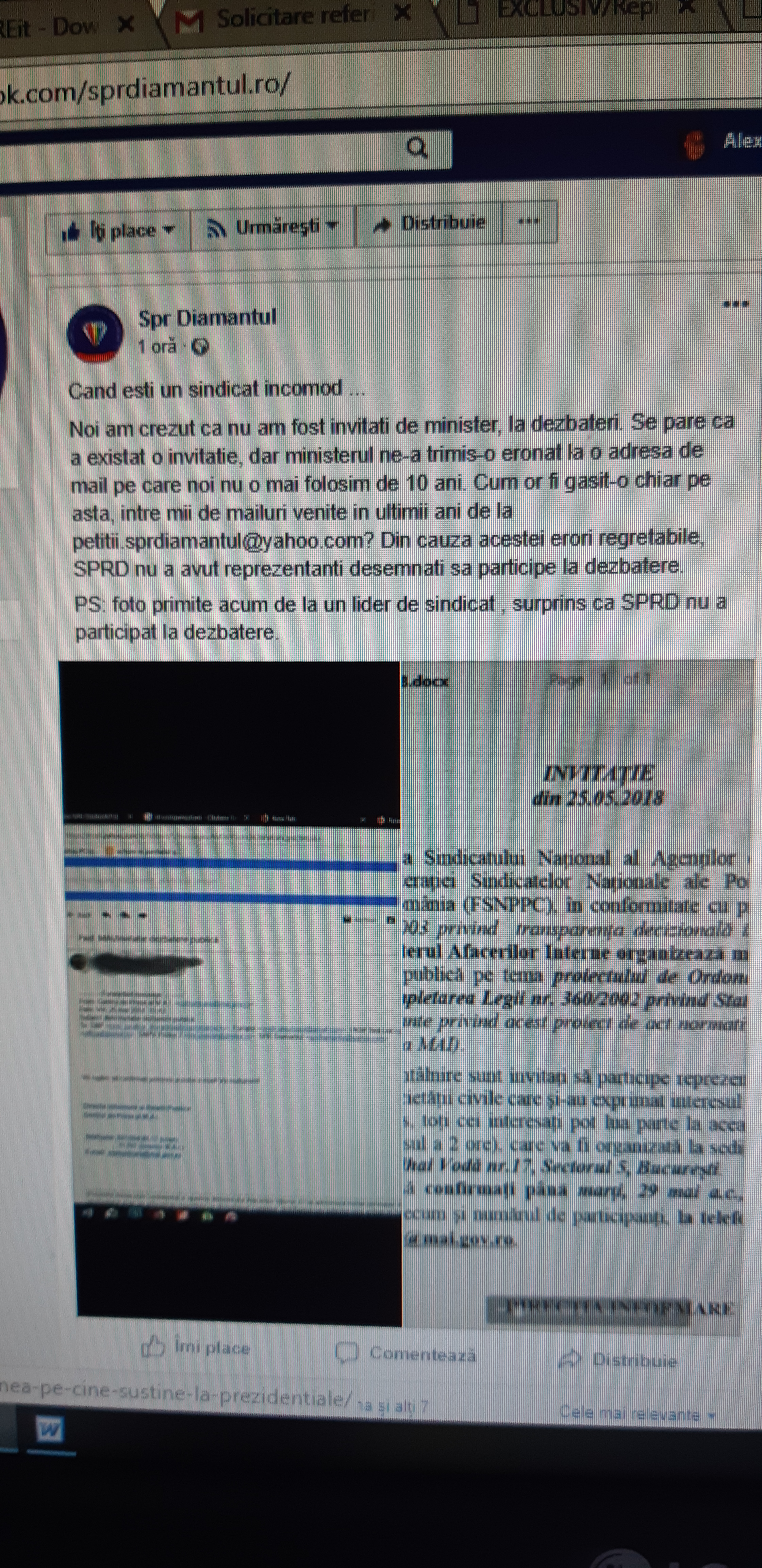În jurul orei 1626, pe pagina oficială de Facebook a sindicatului a fost postată „tânguirea păscuțiană” cum că, cităm: „Noi am crezut ca nu am fost invitati de minister, la dezbateri. Se pare ca a existat o invitatie, dar ministerul ne-a trimis-o eronat la o adresa de mail pe care noi nu o mai folosim de 10 ani. Cum or fi gasit-o chiar pe asta, intre mii de mailuri venite in ultimii ani de la petitii.sprdiamantul@yahoo.com? Din cauza acestei erori regretabile, SPRD nu a avut reprezentanti desemnati sa participe la dezbatere.”