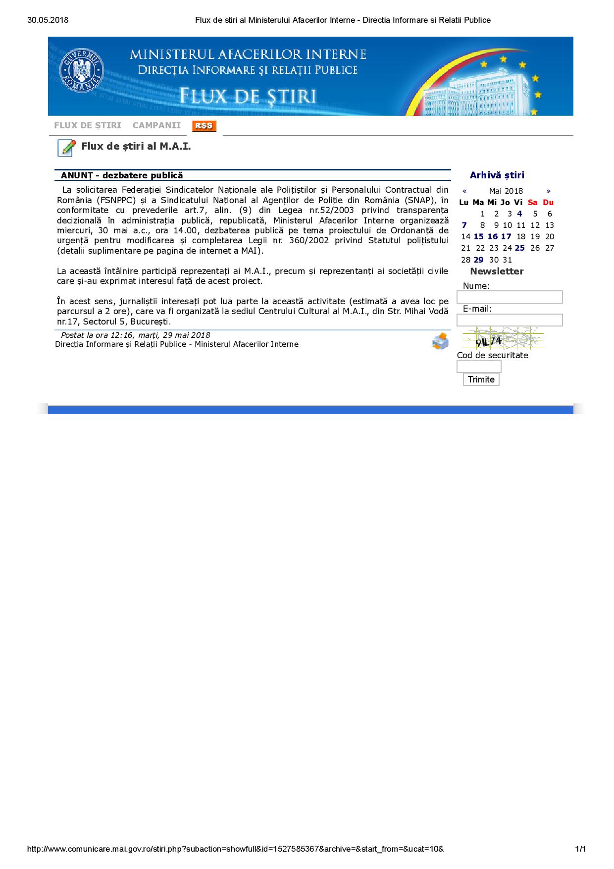 Proiectul de OUG a fost supus „dezbaterii sindicale” în ascuns, la sediul MAI, în data de 29 mai 2018, unde „jmecherașii sindicali” au bătut palma cu M.A.I.-ul obținând un aspect insignifiant: respectarea Deciziei Curții Constituționale nr.166/27 martie 2018 referitoare la excepţia de neconstituţionalitate a dispoziţiilor art.94 alin.(1) lit.n) din Legea nr.188/1999 privind Statutul funcţionarilor publici[1]. Spunem asta întrucât am solicitat, în scris, ca organizatorii să asigure prezența noastră și la „ședința de dialog social” din 29.05.2018, acolo unde, de regulă, se „fac blaturile”.