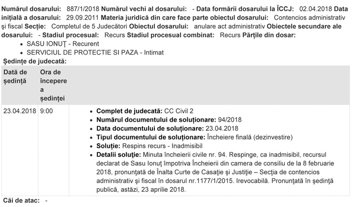 – HG nr.01050/2002 privind “lista documentelor clasificate din cadrul Serviciului Roman de Informatii” – Sedinta din data de 28.08.2017 la ora 09:00 Complet: 11 COM F Respinge cererea de declasificare a HG 01050/2002 ca promovată împotriva unei persoane fără calitate procesuală pasivă. Respinge ca fiind fără obiect cererea de declasificare a Ordinului Directorului SRI nr. 1083/2006, a fişei de observaţie din perioada 3-6 septembrie 2012 emisă de Spitalul Clinic de Urgenţă „Dr. Agripa Ionescu ” şi a fişei de expunere la riscuri profesionale a reclamantului pe anul 2012. Respinge ca neîntemeiate cererile de declasificare a celorlalte documente şi de eliberare a autorizaţiei de acces la informaţii clasificate. Cu drept de recurs în 15 ziLe de la comunicare, cale de atac ce se va depune la Curtea de Apel Ploieşti. Pronunţată în şedinţă publică. Hotarare 158/2017 din 28.08.2017 (https://www.jurisprudenta.com/dosare-proc…/…/827q42q2016-42/)