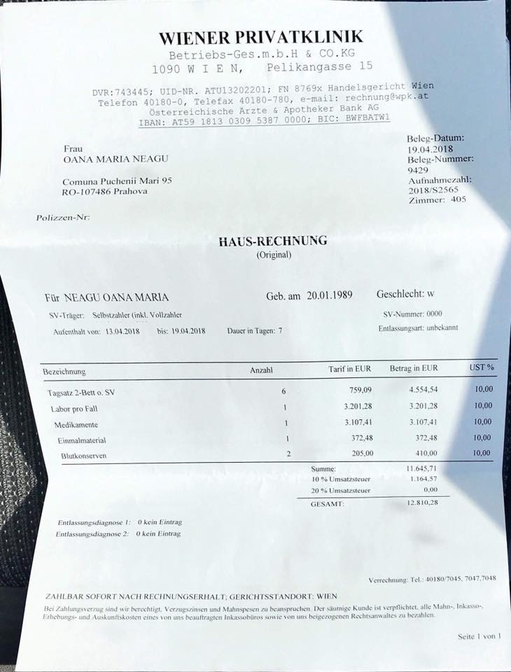 La Viena Oana are parte de servicii medicale foarte bune, insa costurile sunt extrem de ridicate. Din cauza mai multor complicatii, tratamentul pentru primele 2 luni + 3 sedinte de chimioterapie au costat 60 000 EUR. Pentru continuarea procedurilor medicale la Viena – tratament si operatie (vezi foto jos, dă click) – este nevoie de inca 175. 000 EUR.