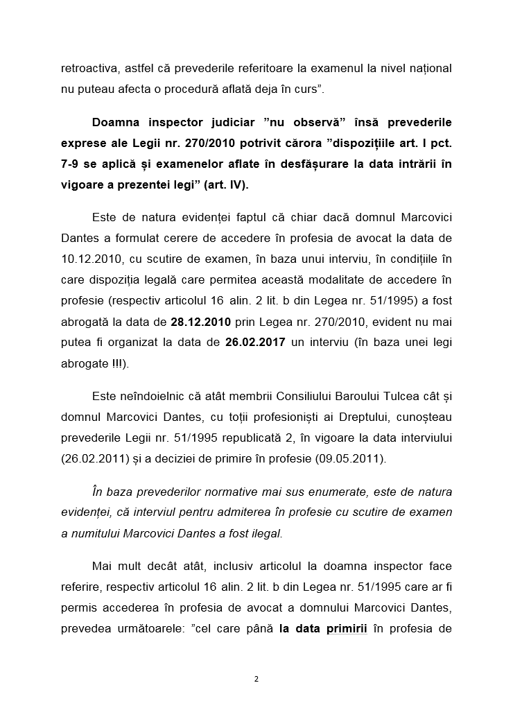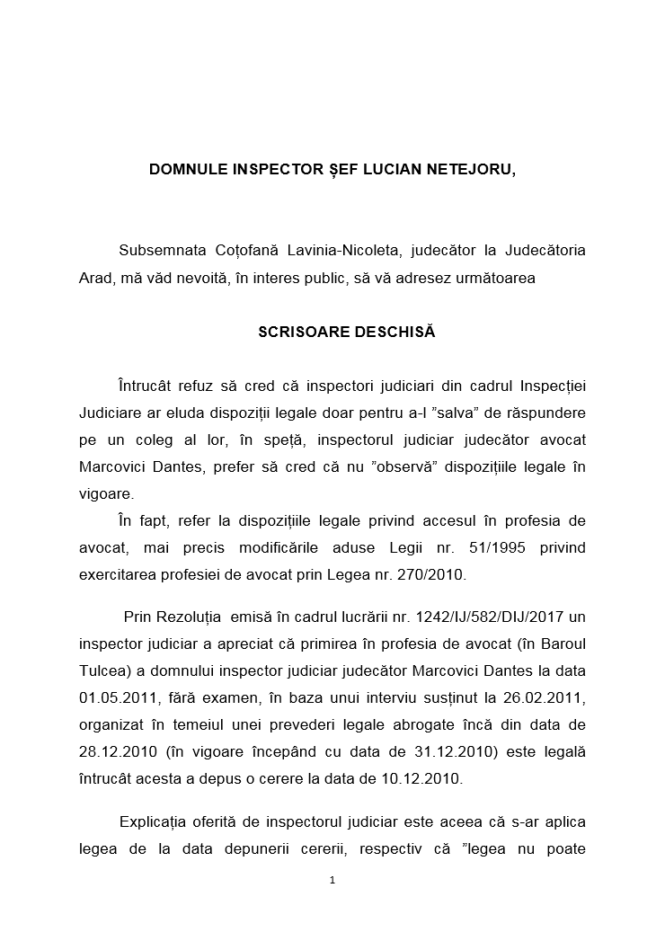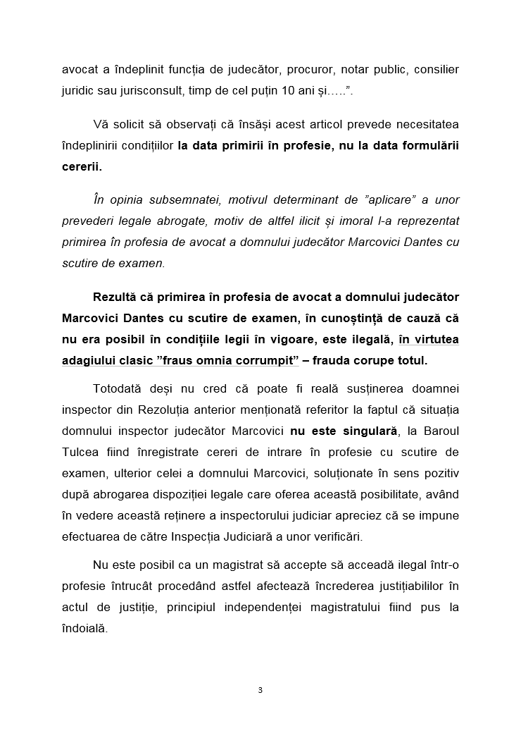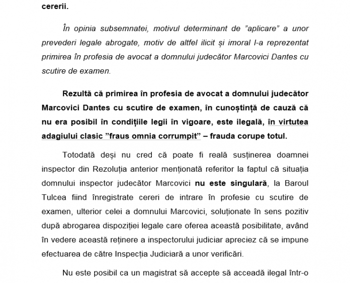 Reamintim ca, magistratul Lavinia Cotofana a formulat plangere penala impotriva inspectorului judiciar Marcovici Dantes pentru mai multe fapte, inclusiv intrarea ilegala in Barou a acestuia.