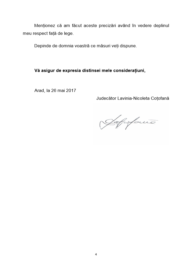 Reamintim ca, Judecatorul Nicoleta Lavinia Cotofana este singurul magistrat exclus din magistratura pentru faptul ca a aplicat legea in integralitatea ei si a sesizat organelor de cercetare penala, conform legii, suspiciunile de deturnare de fonduri publice facute de avocati cu sprijinul unor magistrati de la Judecatoria Arad, fapte/indicii pe care le-a constatat in exercitarea functiei publice de judecator.