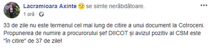 “33 de zile nu este termenul cel mai lung de citire a unui document la Cotroceni. Propunerea de numire a procurorului sef DIICOT si avizul pozitiv al CSM este ‘in citire’ de 37 de zile!”.
