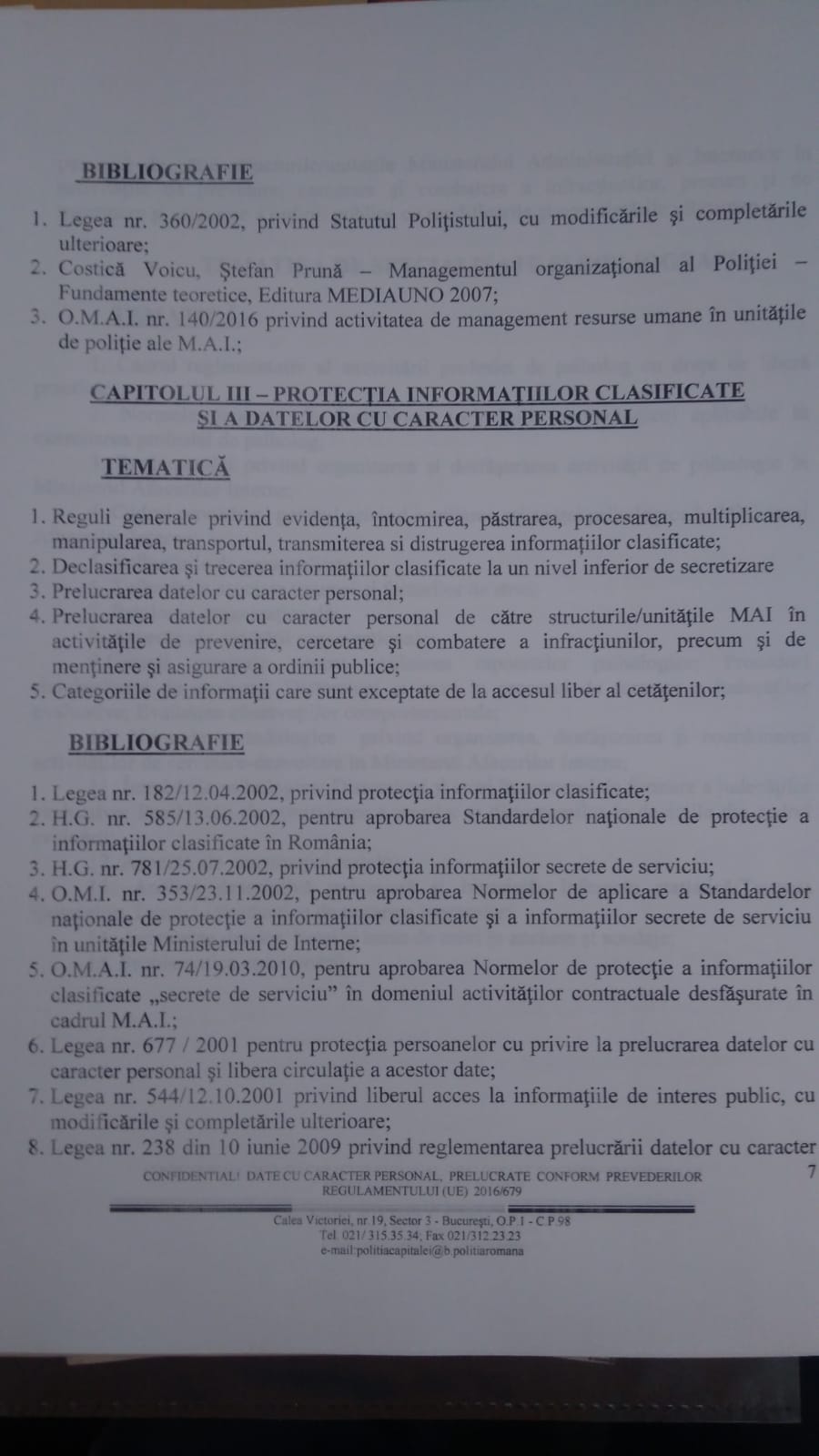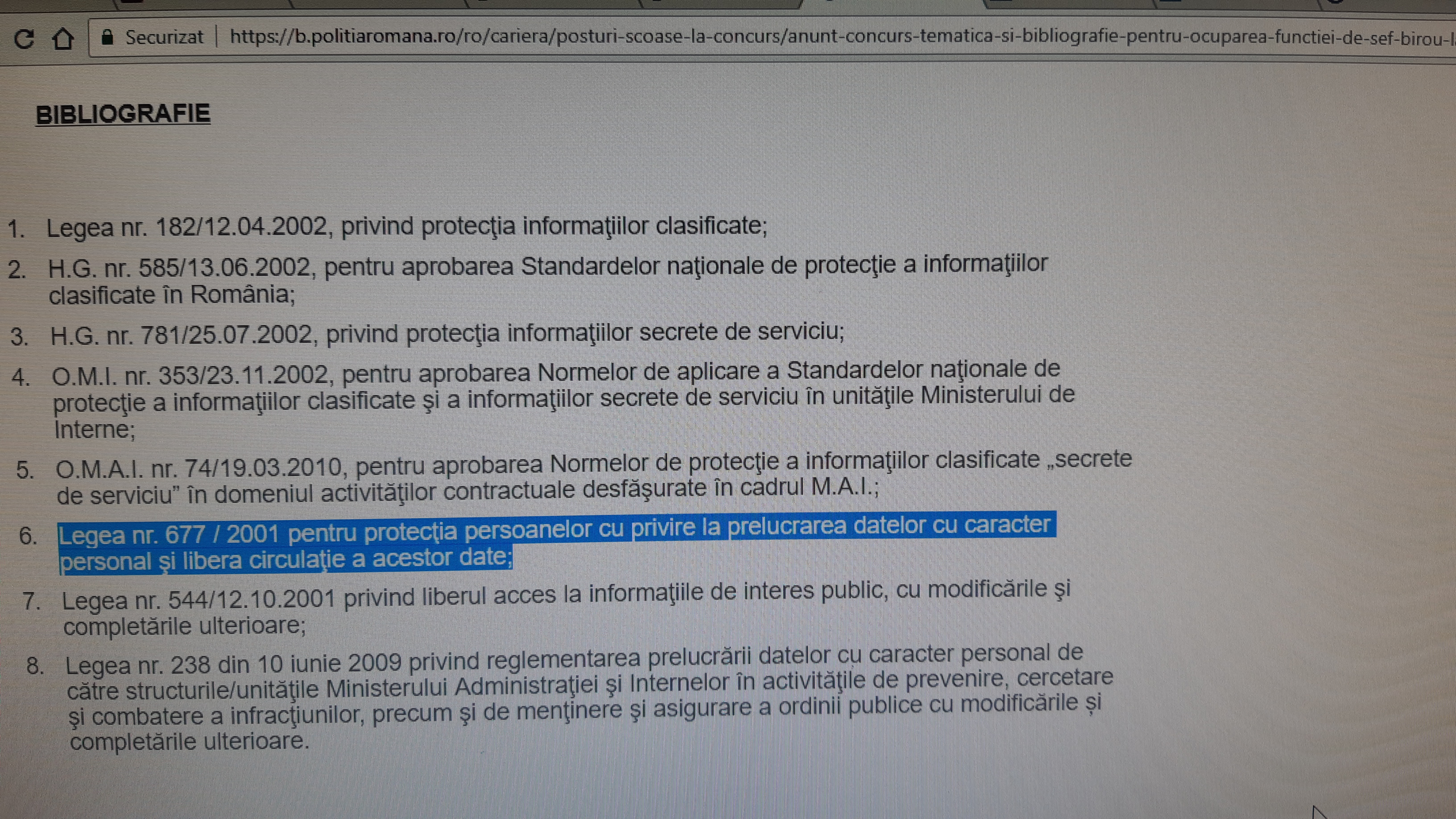 În bibliografia publicată pe sitte-ul D.G.P.M.B. pentru ocuparea postului de șef-polițist al Biroului de Psihologie a fost introdusă ca și tematică: Legea nr.677/2001 pentru protectia persoanelor cu privire la prelucrarea datelor cu caracter personal si libera circulatie a acestor date publicata in Monitorul Oficial nr. 790 din 12 decembrie 2001 (atașăm și foto pertinente).