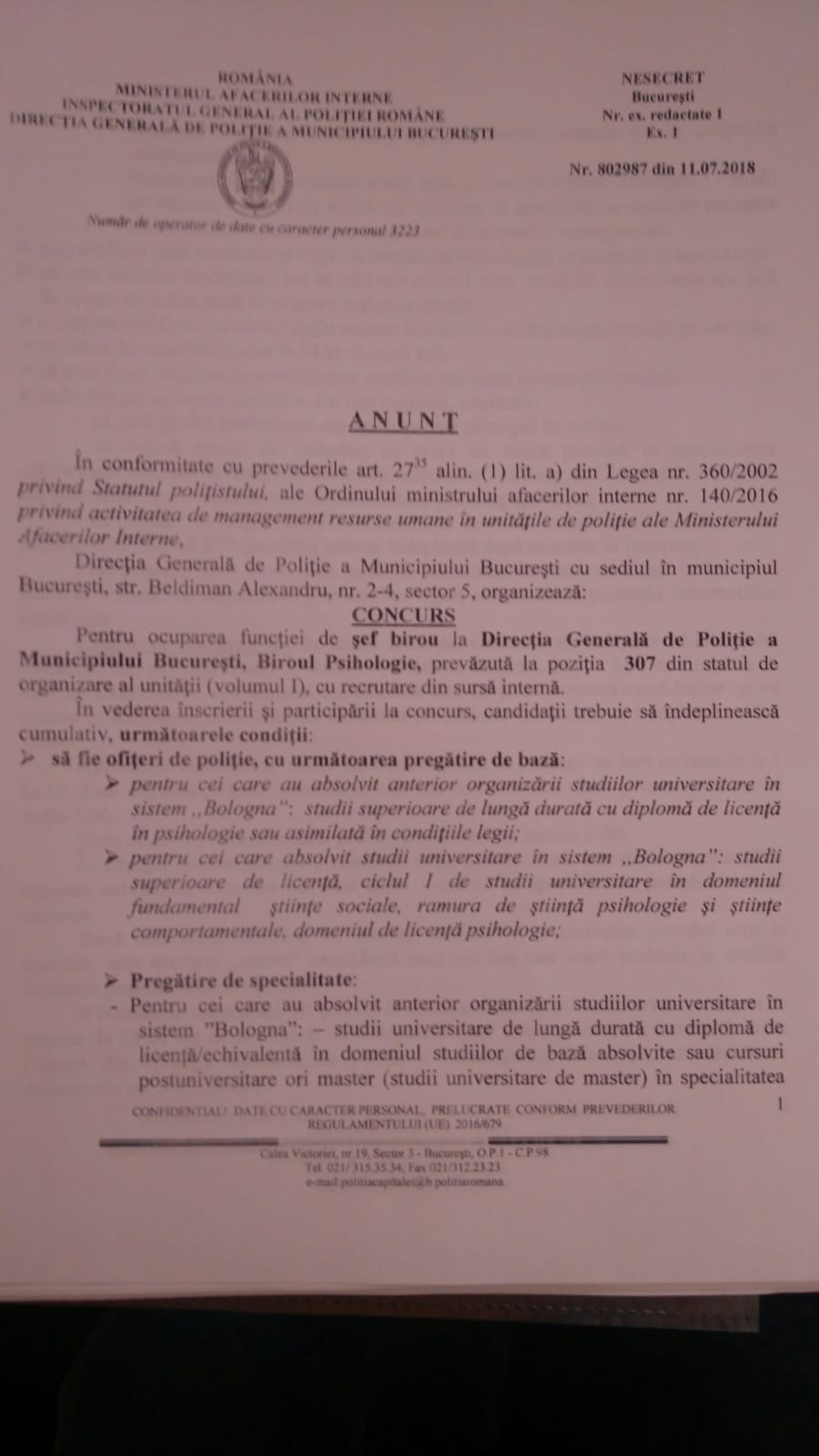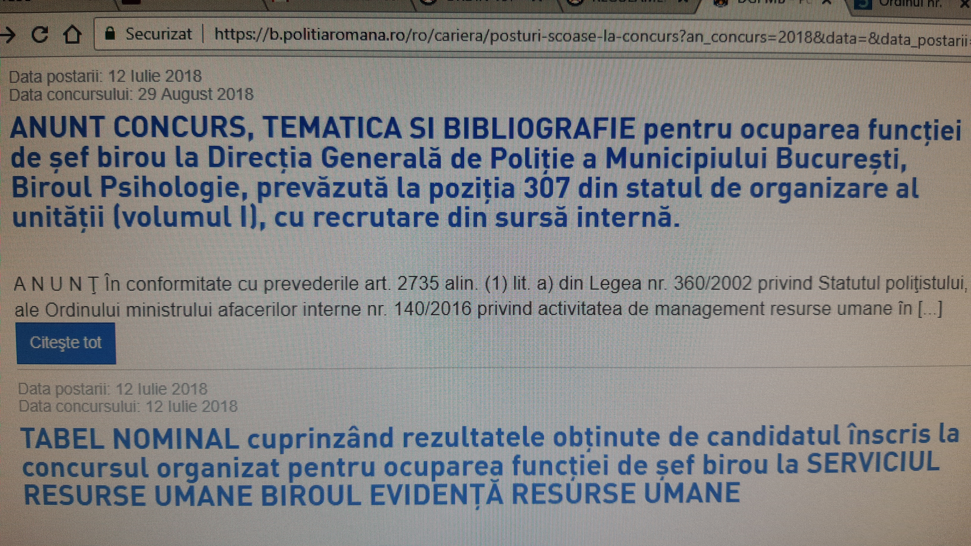 - să anulați concursul pentru ocuparea postului de șef birou psihologic DGPMB ce urmează să fie susținut în data de 29 august 2018.