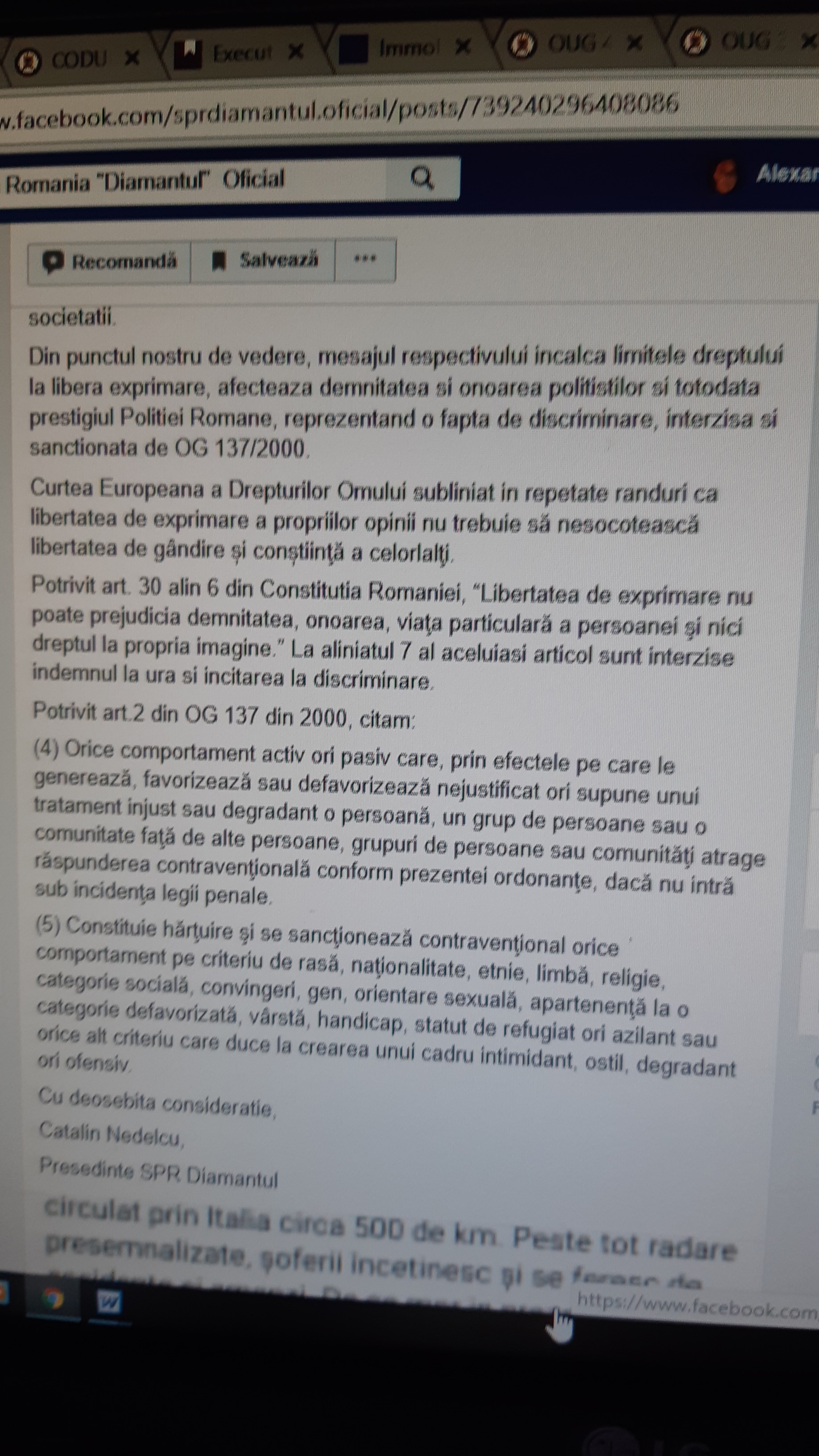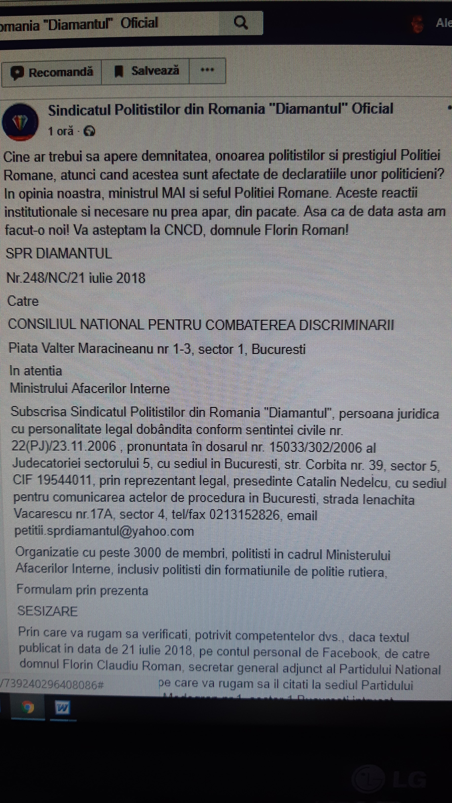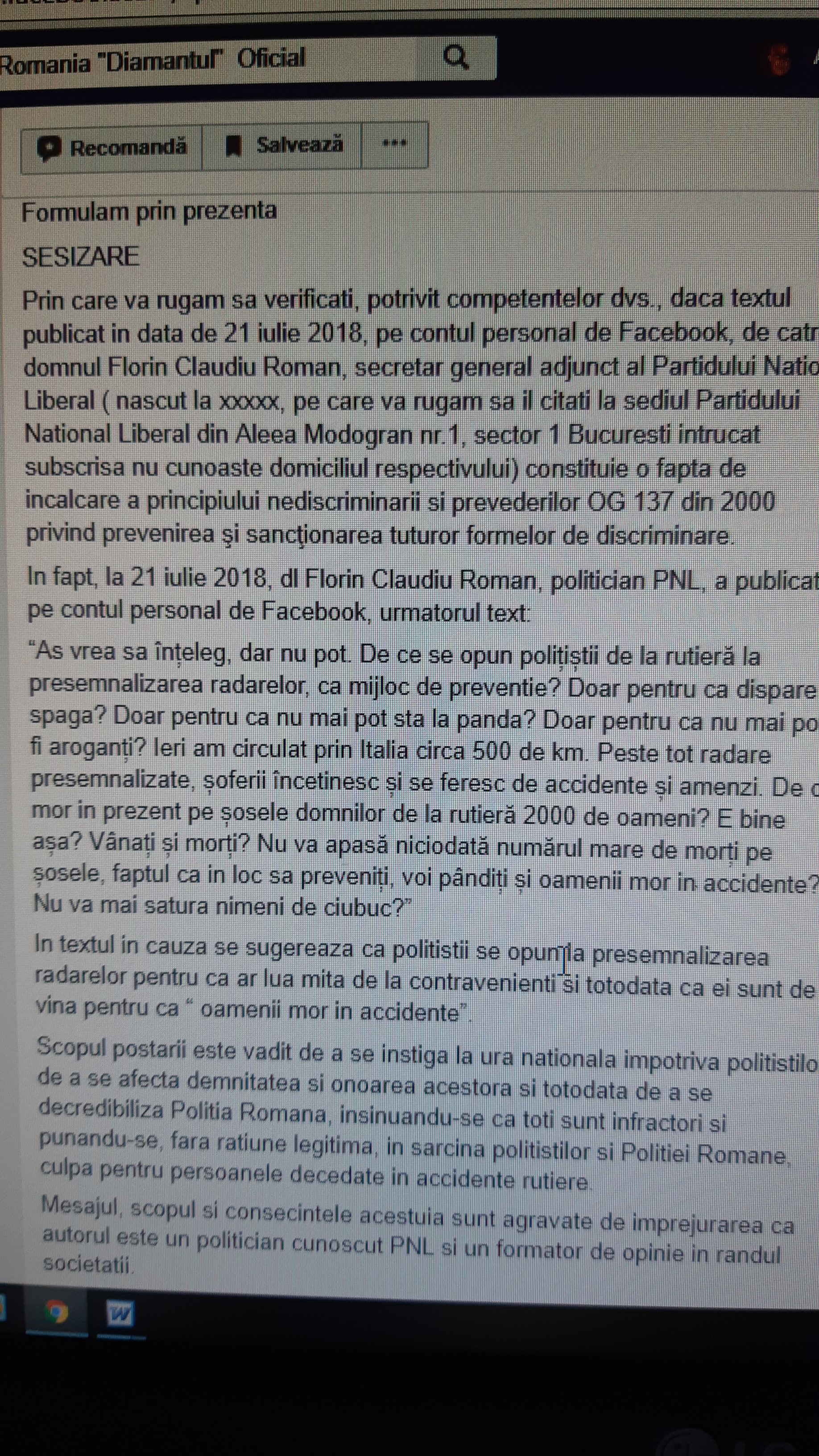 La data de 21 iulie 2018, pe pagina oficială a sindicatului „Diaamntul” de pe rețeaua de socializare FaceBook a fost postată sesizarea nr.248/NC/21 iulie 2018 având ca obiect, cităm: „ […] va rugam sa verificati, potrivit competentelor dvs., daca textul publicat in data de 21 iulie 2018, pe contul personal de Facebook, de catre domnul Florin Claudiu Roman, secretar general adjunct al Partidului National Liberal ( nascut la xxxxx, pe care va rugam sa il citati la sediul Partidului National Liberal din Aleea Modogran nr.1, sector 1 Bucuresti intrucat subscrisa nu cunoaste domiciliul respectivului) constituie o fapta de incalcare a principiului nediscriminarii si prevederilor OG 137 din 2000 privind prevenirea şi sancţionarea tuturor formelor de discriminare.” .