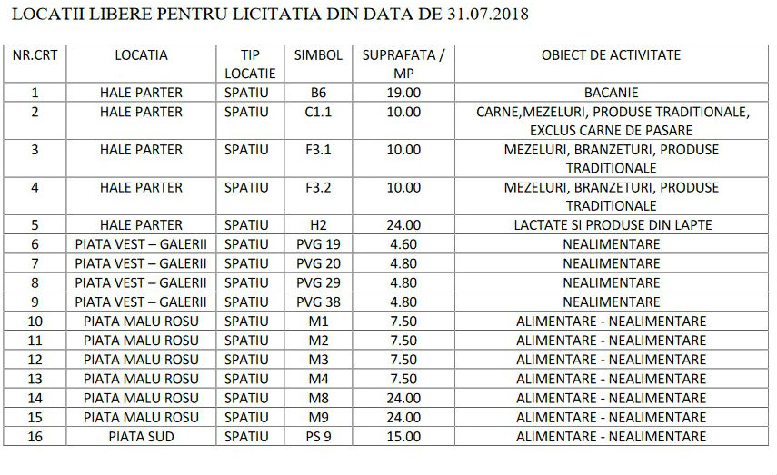 SC Hale si Piete SA, cu sediul in Ploiesti, str. Grivitei nr. 15, jud. Prahova, organizeaza in data de 31.07.2018, incepand cu ora 10,00, licitatii publice deschise, cu strigare, pentru inchiriere locatii in Halele Centrale si pietele din Municipiul Ploiesti.