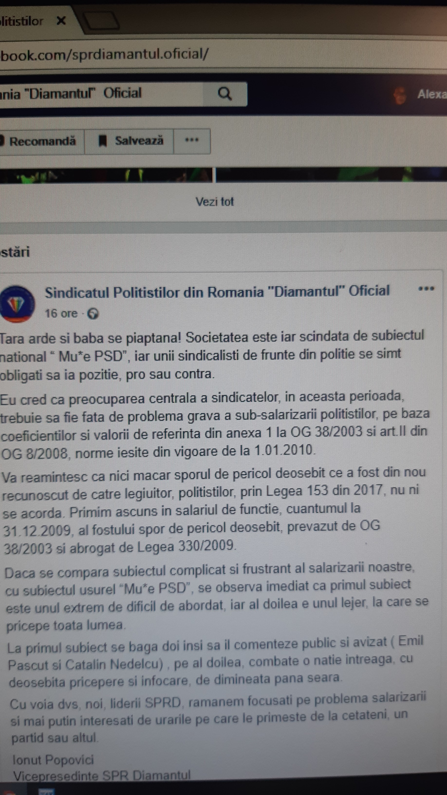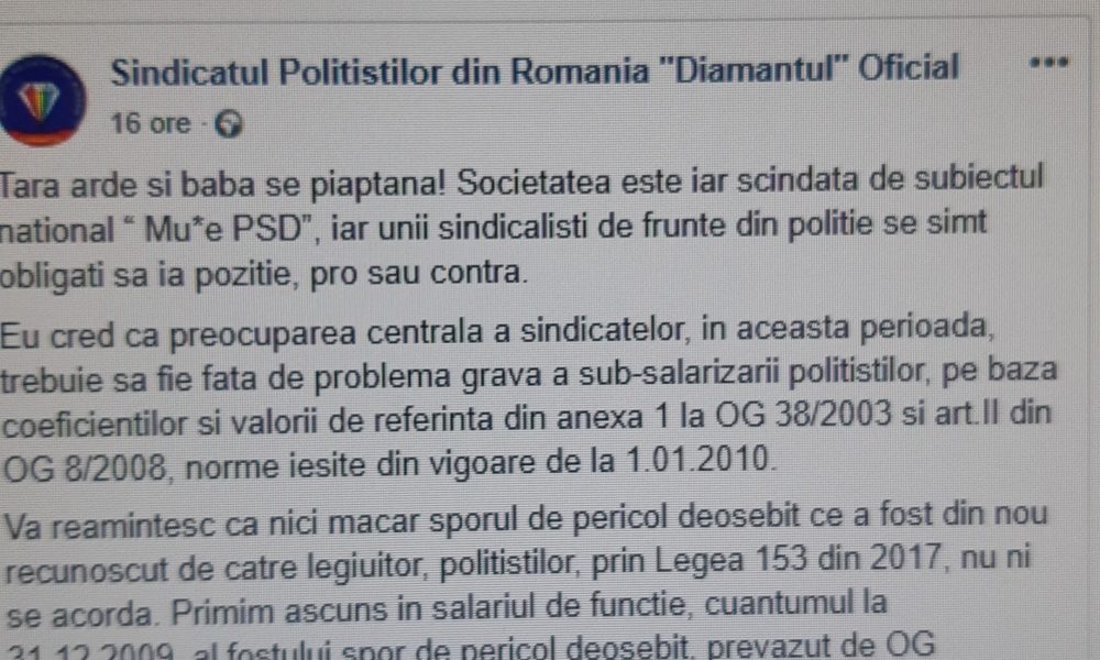 În data de 01 august 2018, nimeni altul decât „polițistul judiciarist” Popovici Ionuț (el zice că ar fii vicepreședinte al sindicatului „Diamantul”) se jeluiește pe faceBook că a luat țara foc din cauza integrării în UE a PSD-ului… și că nu interesează pe nimeni de problema salarizării polițiștilor afară de „diamantini”.