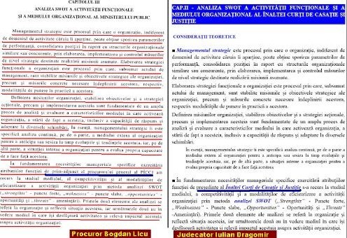 Hotnews scria: „Este vorba de capitolul III „Analiza SWOT a activităţii funcţionale şi a mediului organizaţional al Ministerului Public” din proiectul procurorului Bogdan Licu şi de capitolul II „Analiza SWOT a activităţii funcţionale şi a mediului organizaţional al Înaltei Curţi de Casaţie şi Justiţie” din proiectul judecătorului Ilie Iulian Dragomir. Aceste pagini descriu conceptul analizei SWOT şi avantajele acestei metode”.
