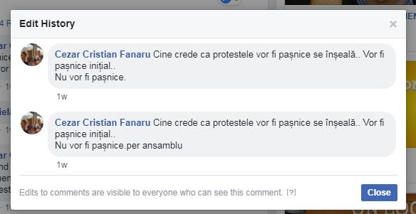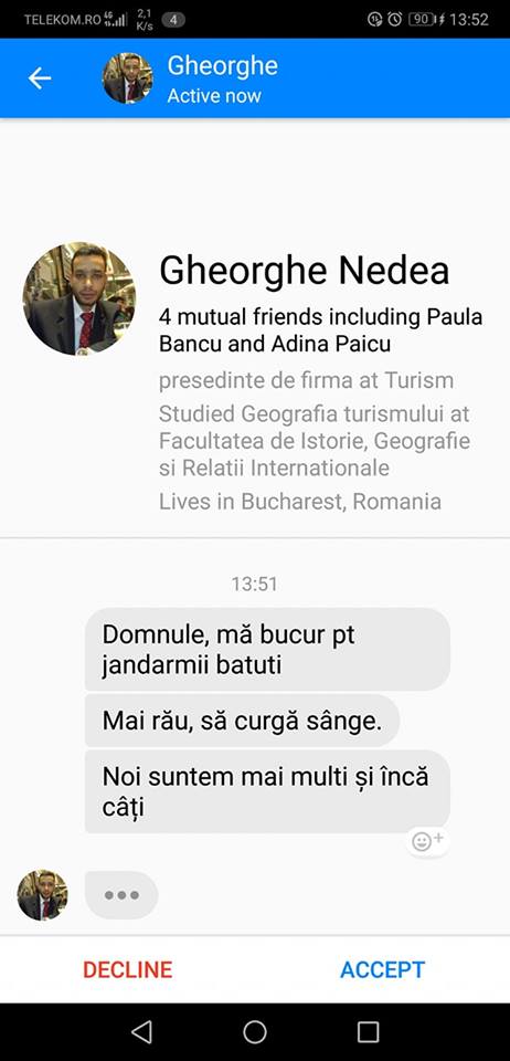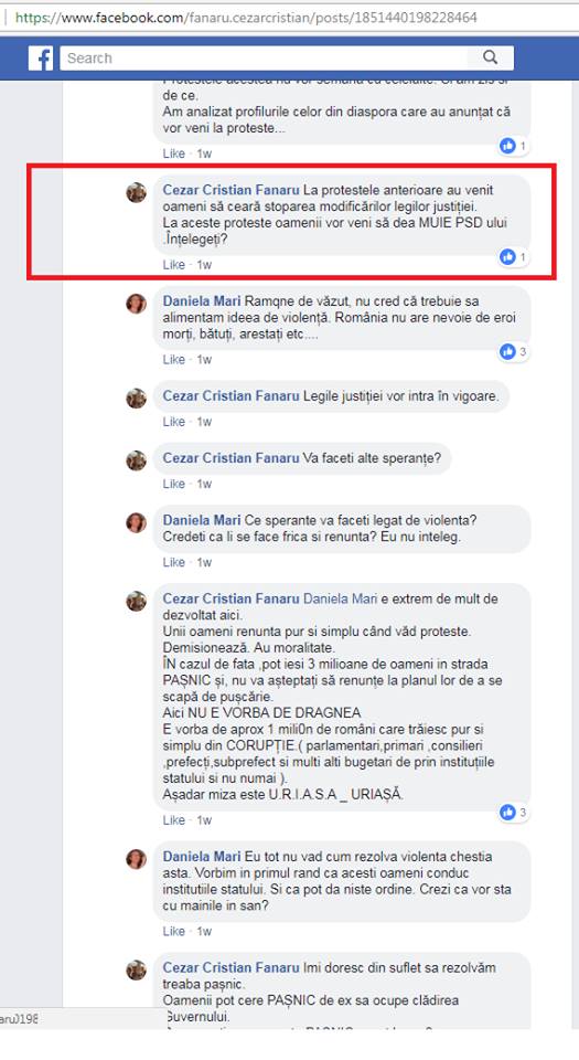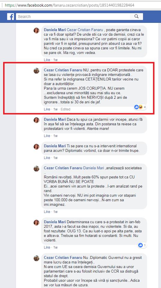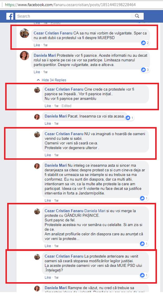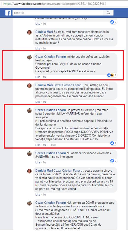 Ii rog pe cei care vad astfel de mesaje ori comentarii pe facebook, prin care persoane incitau la violente cu ocazia acestui protest, sa le faca print screen si sa le posteze la comentarii la aceasta postare.( Preşedintele Coaliţiei Românilor pentru Combaterea Corupţiei (SUA), Chris Terhes,).
