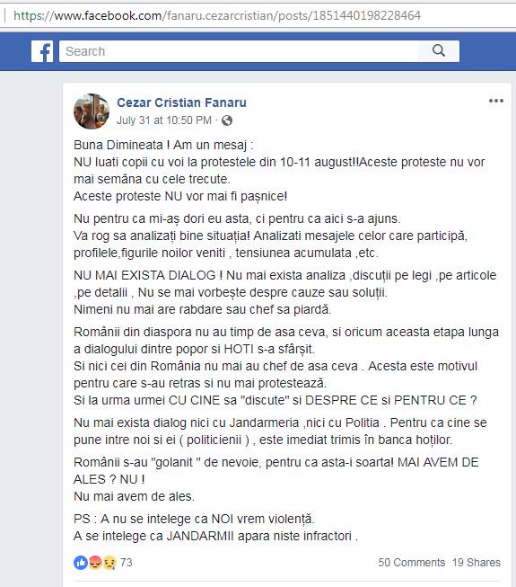 Mesajul a fost postat pe Facebook pe data de 1 august, cu 10 zile inaintea asa-zisului protest “al diasporei”, in cadrul caruia anarhisti au atacat jandarmii si au dorit sa intre in Guvern.