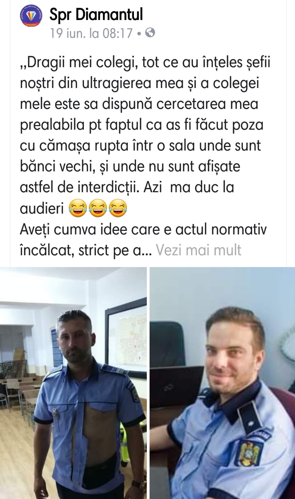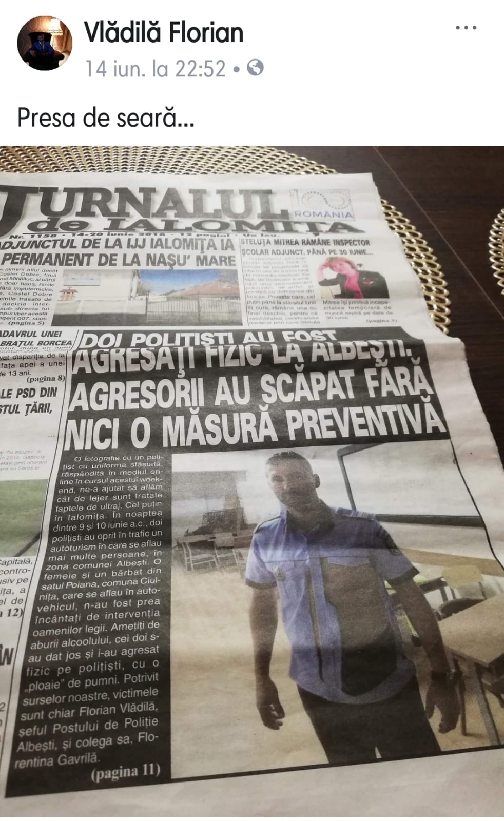 Ei bine, în data de 19 iunie 2018 ora 0817, SPR Diamantul posta fotografiile unui polițist ialomițean ultragiat care, culmea, s-a dispus cercetarea lui disciplinară pentru că a făcut fotografiile (după ce a fost lovit) „într-o încăpere clasificată” din IPJ Ialomița. Ultragiatul este Vlădilă Florian, fostul șef de post din comuna Albești, jud. Ialomița dar și un „diamantin veritabil”. Localnicii din comuna Albești susțin că ultragiatul Vlădilă era mai mult abuzator în acea localitate decât polițist… Spunem „era” fiindcă cercetarea disciplinară a polițistului: CNP-ist, SNPPC-ist, SNAP-ist, diamantin și I.P.A., Vlădilă Florian, solicitată de nimeni altul decât actualul adjunct al lui Ivan Cristian, Iordache Mihail Valentin (șex-șef Birou Control intern – IPJ Ialomița) și aprobată de Ivan Cristina „s-a evaporat”. Ptiu’ drace, fenomene paranormale la astia, ca doar au doar OIZN-uri in partea superioara a corpului.