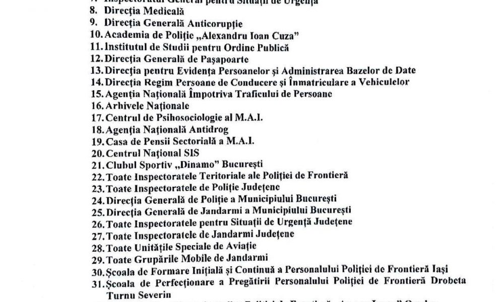 N.R. Considerăm că Ministerul Afacerilor Interne ar trebui desființat iar Inspectoratele Generale să fie subordonate direct Parlamentului României. Astfel, abuzurile și ilegalitățile din: Poliție, Jandarmerie, Imigrăsi, Situații de Urgență, Aviație vor fii cu mult diminuate iar instanțele de judecată nu vor mai fii sufocate cu plângeri împotriva M.A.I.-ului, instituție care, din păcate doar creează probleme și favorizează distrugerea structurilor subordonate respectiv corupția în rândurile personalului propriu prin nerespectarea, neaplicarea Legii (emiterea de ordine, instrucțiuni, dispoziții interne prin care textul de Lege este reinterpretat în defavoarea angajatului M.A.I. și a cetățeanului).