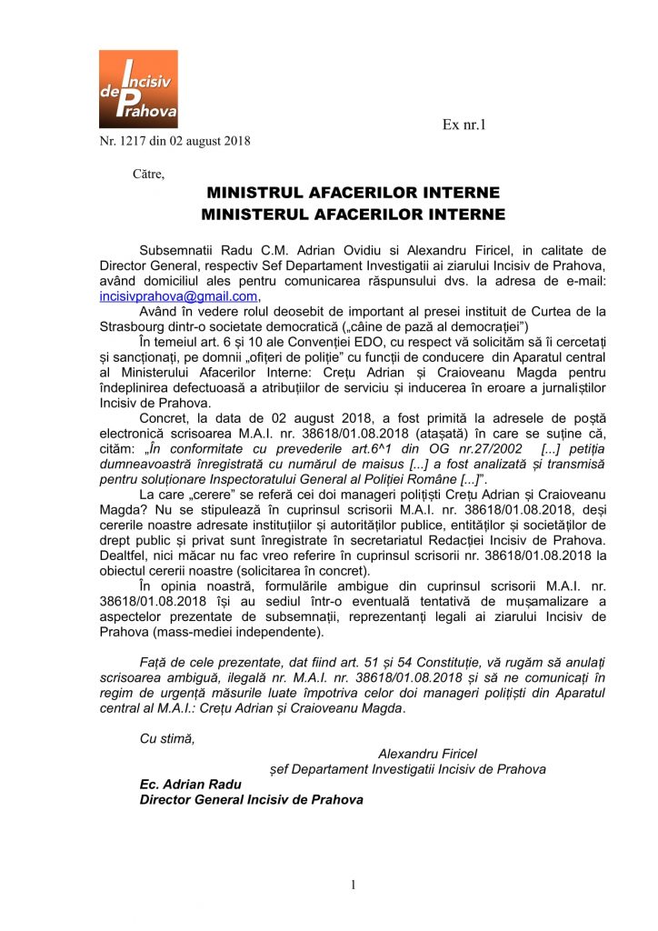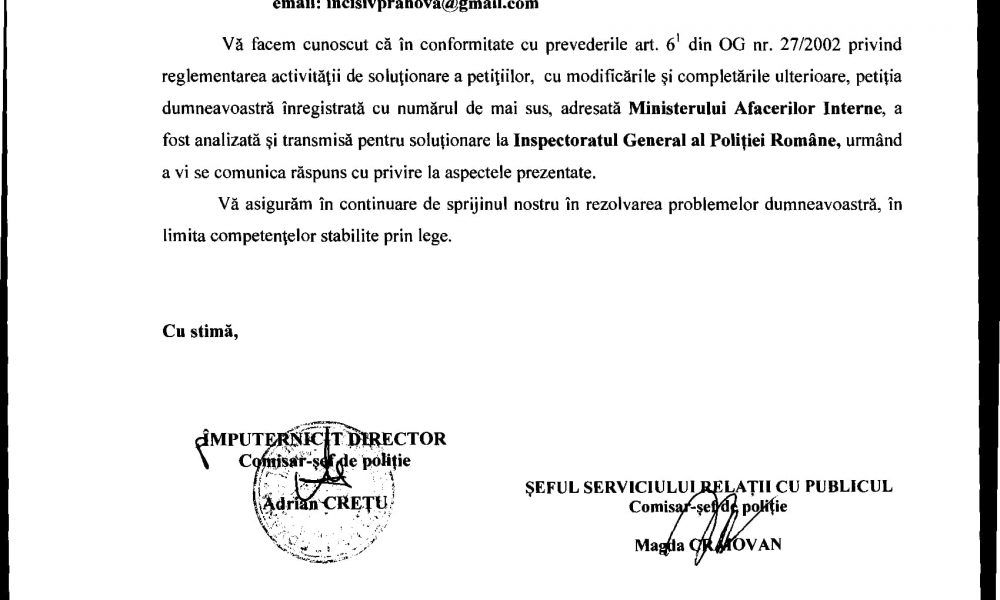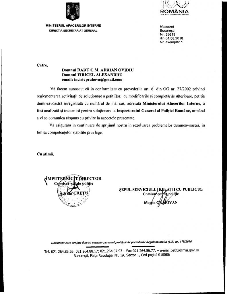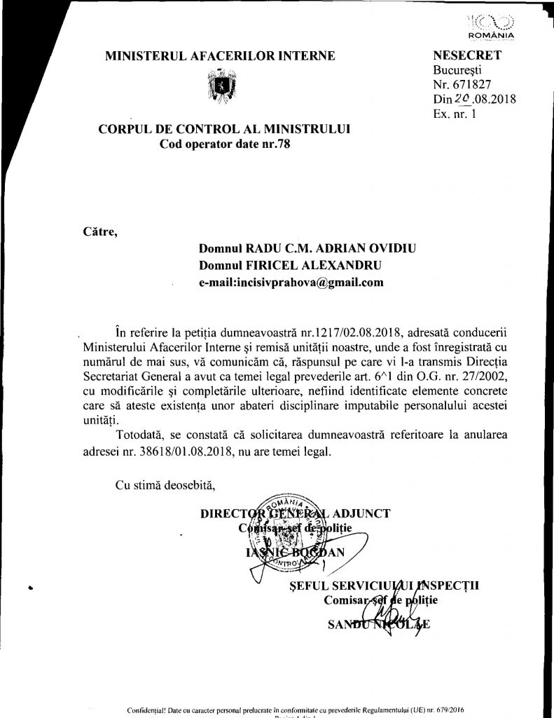 Ei bine, în urma unei ciorne primite de la M.A.I. din care nu se înțelege absolut nimic (38618/01.08.2018), Incisiv de Prahova a solicitat Ministrului M.A.I. și M.A.I. să îi cerceteze și sancționeze pe semnatarii acelei adrese ambigue: Craiovan și Crețu. Iașnic și Sandu (facem pariu că dețin și aviz de Poliție Judiciară), mari șefi de controlori intrerni, susțin că cei doi (Craiovan și Crețu) pot scrie ce vor în „înscrisrui oficiale” fiindcă nu pot fii „identificate elemente concrete care sä ateste existenta unor abateri disciplinare imputabile personalului acestei unitati” (conform adresei semante de acești „polițiști-controlori” de birou nr.671827/20.08.2018).
