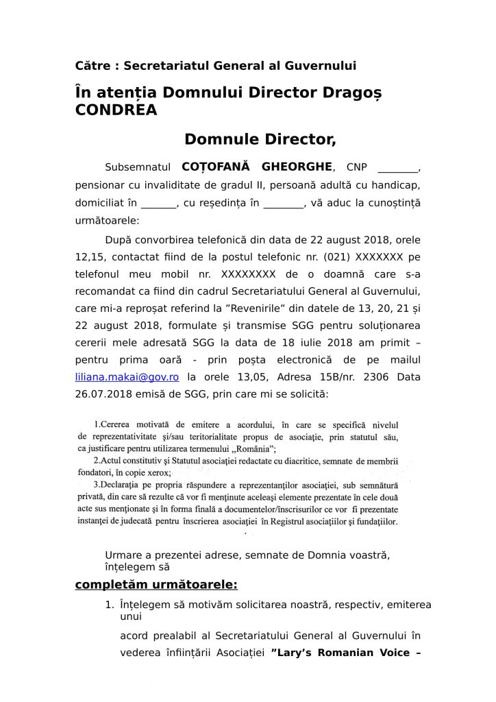 În fapt, domnul prof. univ. dr. Gheorghe Coțofană a solicitat un acord prealabil al acestei administrații a Guvernului, conform art.7 alin. 3^2[1] din OG nr.26/2000 tocmai pentru a înființa o asociație care, odată înființată, ar putea sprijini persoanele care au suferit mutilanta operație de laringectomie totală, în urma unui cancer laringian. Doar că birocrați inculți, necunoscători ai Legii (dreptului) din Secretariatul General al Guvernului au întocmit proiectul adresei semnate cu mult-prea multă ușurință(dezinteres)  de directorul Condrea… mai exact, funcționărime a SGG-ului cu creierele înghețate de la aerul condiționat din birouri ori prea obosite de vacanțele luxoase în care or fi consumat produse interzise/alcool s-au gândit că dacă solicită petentului să îndeplinească condiții neimpuse de Lege, vor evidenția cât de deștepți sunt. Fals!