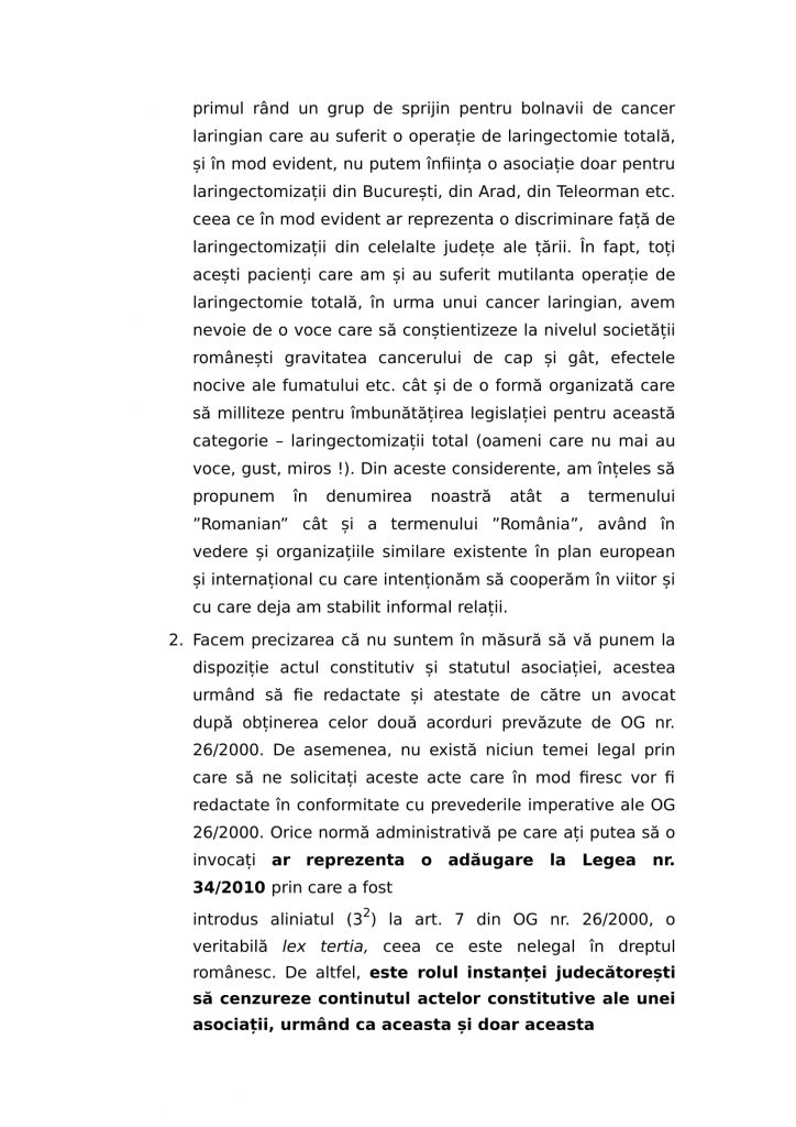 Facem precizarea că nu suntem în măsură să vă punem la dispoziție actul constitutiv și statutul asociației, acestea urmând să fie redactate și atestate de către un avocat după obținerea celor două acorduri prevăzute de OG nr. 26/2000. De asemenea, nu există niciun temei legal prin care să ne solicitați aceste acte care în mod firesc vor fi redactate în conformitate cu prevederile imperative ale OG 26/2000. Orice normă administrativă pe care ați putea să o invocați ar reprezenta o adăugare la Legea nr. 34/2010 prin care a fost introdus aliniatul (32)  la art. 7 din OG nr. 26/2000, o veritabilă lex tertia, ceea ce este nelegal în dreptul românesc. De altfel, este rolul instanței judecătorești să cenzureze continutul actelor constitutive ale unei asociații, urmând ca aceasta și doar aceasta – instanța judecătorească, să dispună în numele Legii admiterea sau respingerea  înființării unei asociații. Toate datele vor ajunge oricum în posesia Guvernului prin Ministerul Justiției care ține Registrul Național al asociațiilor și fundațiilor. Mai mult, în procedura judecătorească de autorizare a înființării unei asociații interesele Statului cât și ale Guvernului sunt apărate, la ședință fiind obligatorie prezența unui procuror din cadrul Ministerului Public, aflat sub autoritatea Ministrului Justiției – membru al Guvernului României.”