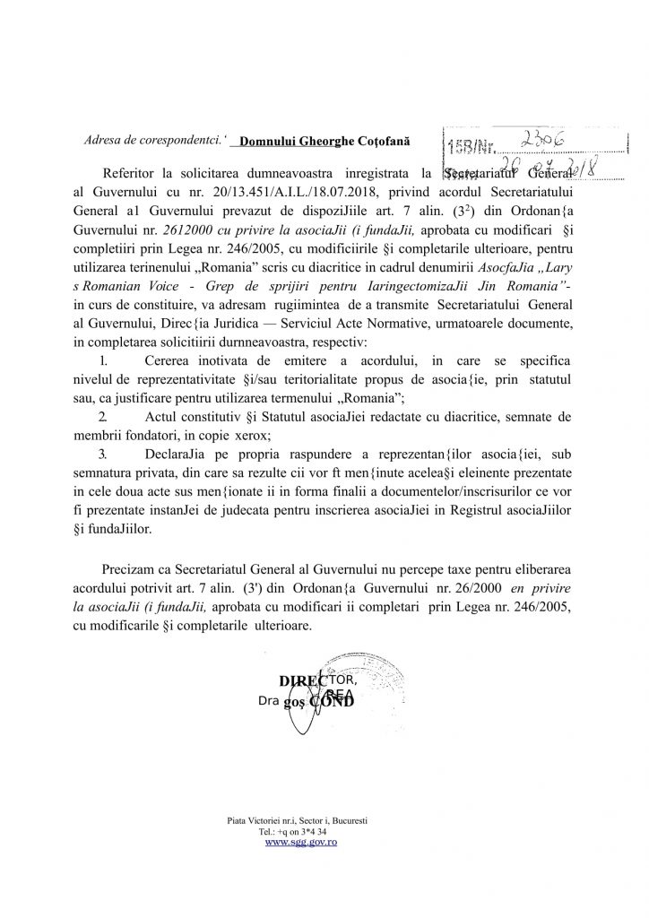 Am rămas uimit la primirea e-mailului domnului prof. univ.dr. Gheorghe Coțofană referitor la disprețul față de Lege și dorința unui om de a înființa o Asociație care să se ocupe îndeaproape de laringectomizații (bolnavii de cancer laringian care au suferit o operație de laringectomie totală) din „statul de drept” România manifestat de Secretariatul General al Guvernului prin directorul Condrea Dragoș.