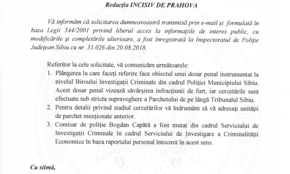 EXCLUSIV/I.P.J. SIBIU CONFIRMĂ FURTUL ÎNTRE POLIȚIȘTI COMIS CHIAR ÎN INCINTA CLĂDIRII ACESTEI ENTITĂȚI M.A.I.! DEZVALUIRILE ZIARULUI INCISIV DE PRAHOVA DIN NOU CONFIRMATE!