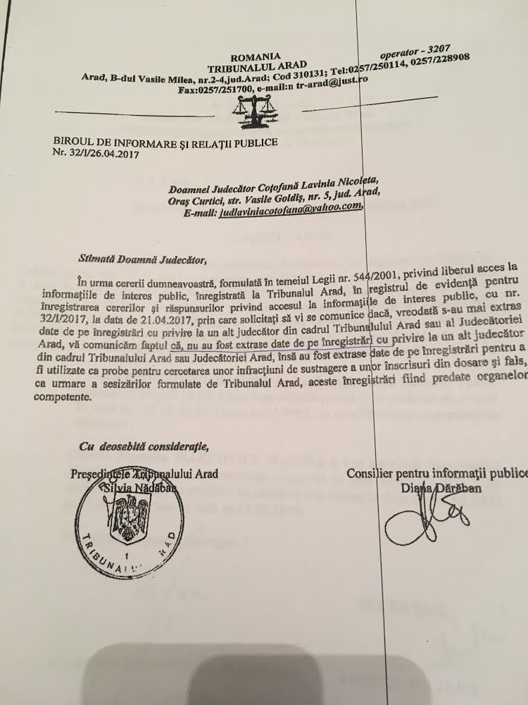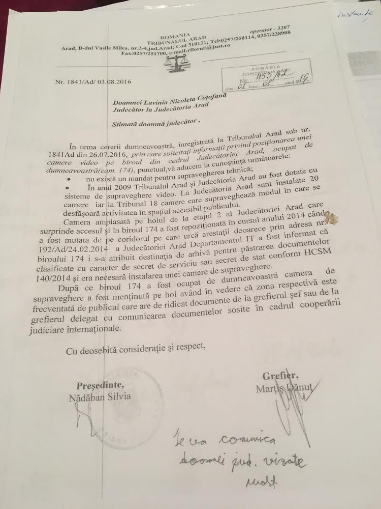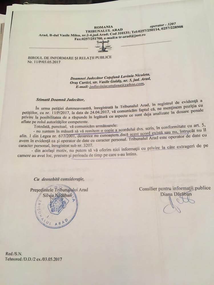 Ce au facut mai departe cei vizați de ancheta penală a DNA (intr-un caz de o importanță deosebita – furtul banilor Ministerului Justitiei de avocați în complicitate cu judecatori) depășește orice imaginație. Au început sa-si supravegheze video colega, fără MANDAT, neexistând nici macar acordul acesteia conform Legii nr 671/2001. Noaptea minții. Va prezentam in continuare 3 adrese ale Tribunalului Arad în care, stupoare, chiar împricinatii recunosc inegalitatea comisă si il iau pe NU în brațe, nu mai stiu nimic, nici cine e vinovat. Nici usturoi nu au mâncat, nici gura nu le miroase. Vom reveni. (Neagu Monica).