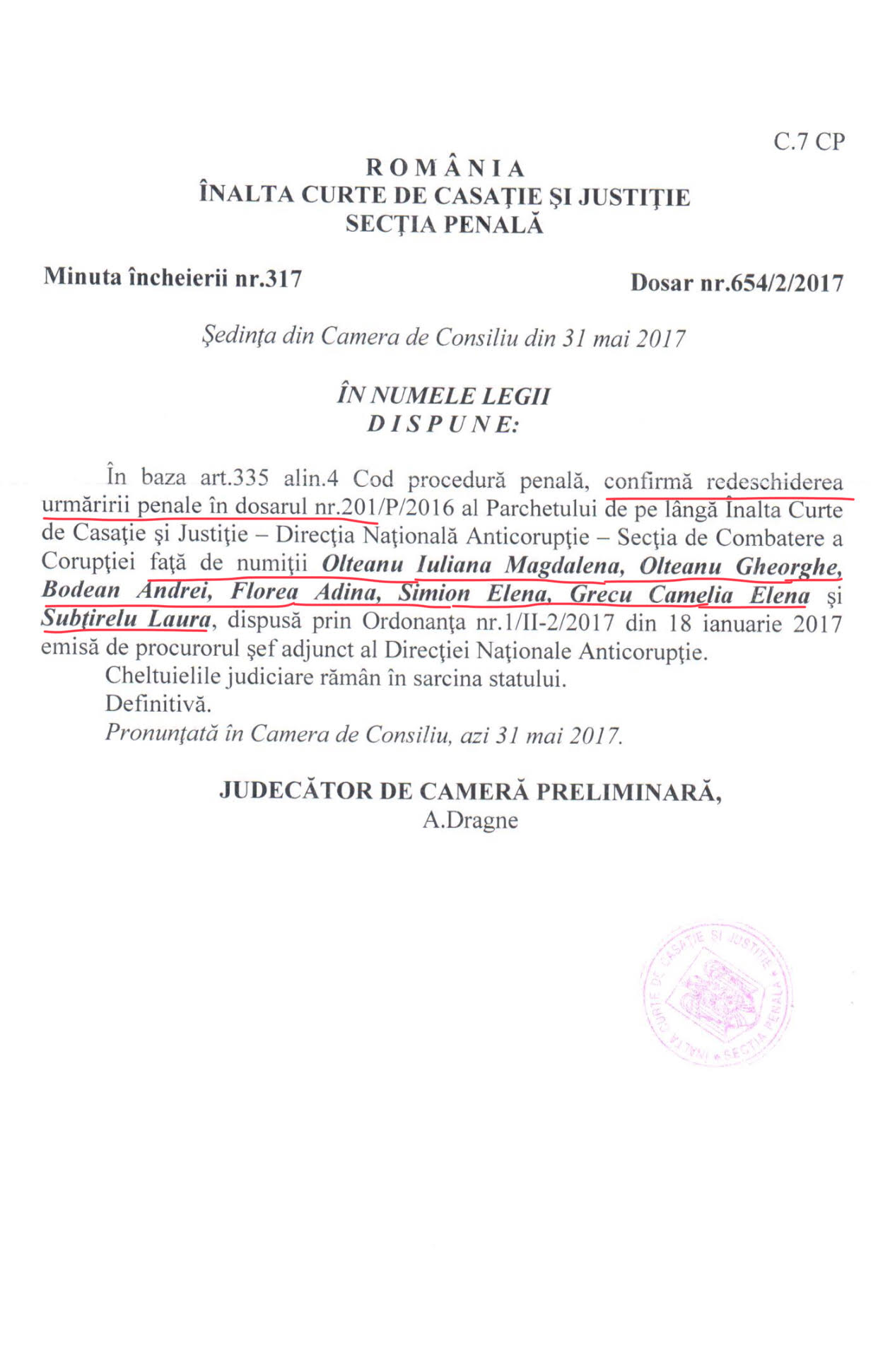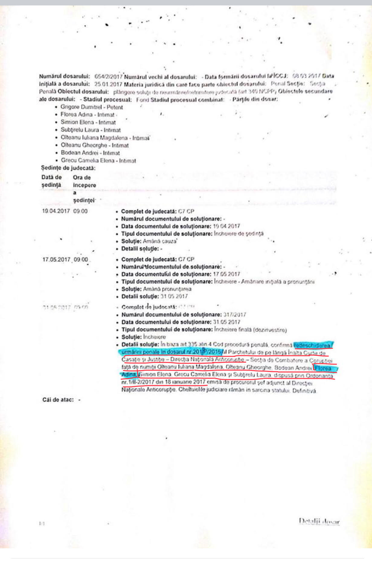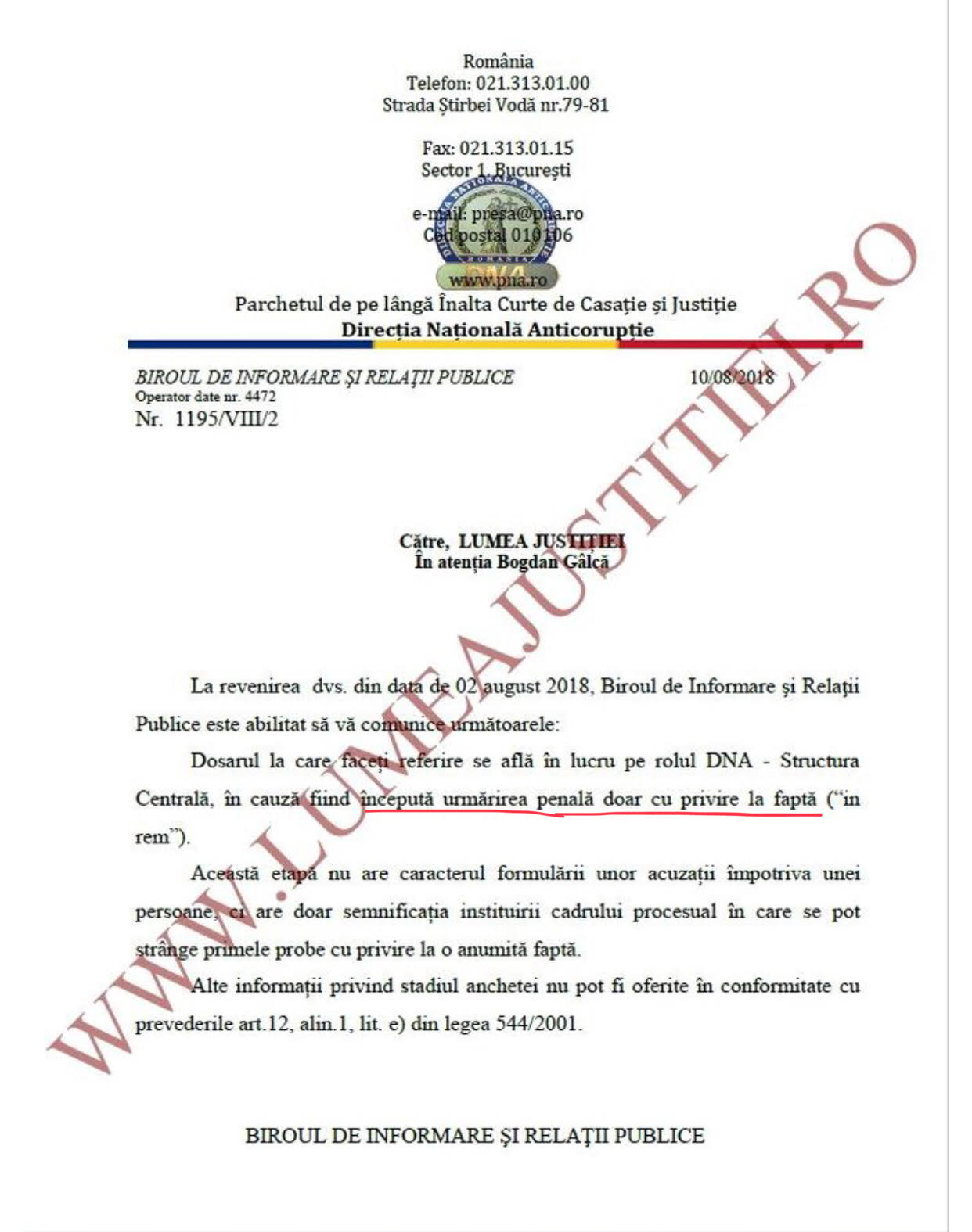 Obiceiurile vechi dispar greu. Dar, mai grav este ca nici nu se dorește sa dispară. Ziarul Incisiv de Prahova a reușit sa intre in posesia hotărârii pronunțate de Înalta Curte de Casație și Justiție de redeschidere a urmăririi penale a procurorilor Adina Florea, Andrei Bodean, înscriși in cursa finala pentru șefia DNA, precum și a celorlalți coinculpați in dosarul in care sunt acuzați de constituire de grup infracțional organizat. Tot din investigațiile efectuate de ziarul nostru am aflat ca DNA a dat un răspuns mincinos către Lumea Justiției in care afirma ca împotriva acestora s-ar fi inceput urmărirea penala cu privire la fapte. Deci, in rem și nu in personam așa cum se poate observa din nominalizarea efectivă a acestora. Se poate deduce cu ușurintă ca aceasta dezinformare are ca scop favorizarea lor in drumul către șefia DNA. Observati mai jos minciuna evident. (Cerasela N.).