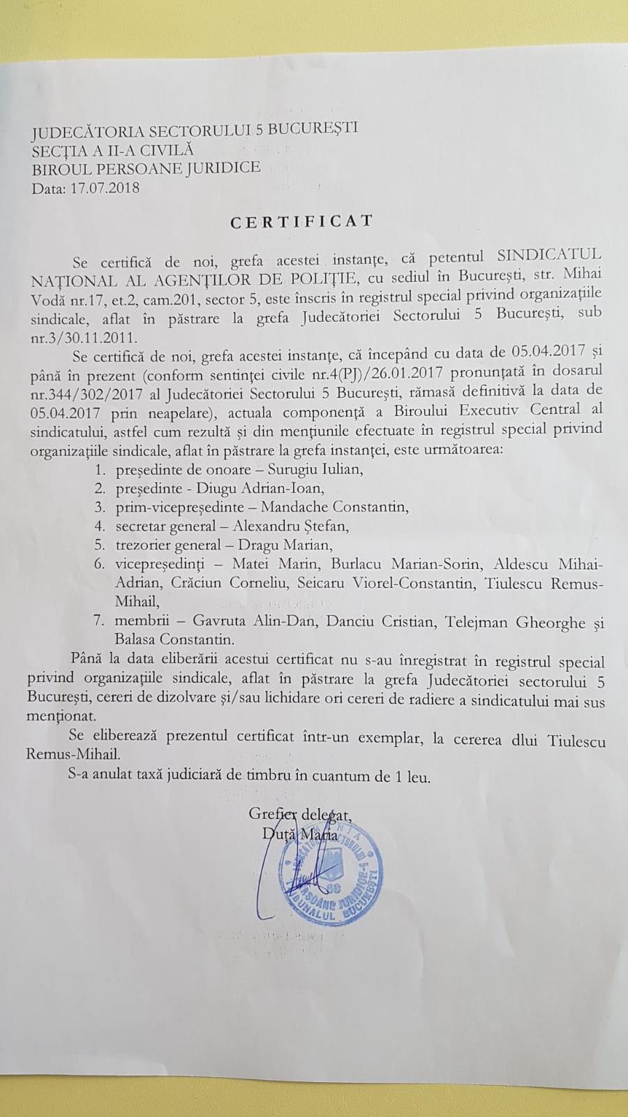 După redactarea sentinței nr.19(PJ)  emisă la data de 06 august 2018 de către Judecătoria Sectorului 5 în care instanța de judecată a stabilit că Sindicatul Național al Agenților de Poliție (S.N.A.P.) a funcționat ilegal începând cu anul 2007 (an în care președintele Surugiu Iulian a fost pensionat) și a articolului Incisiv de Prahova de maisus, pe sitte-ul acestui sindicat, la pagina „conducere” nu mai este afișat niciun personaj „marcant”: pagina se află „în reconstrucție”.