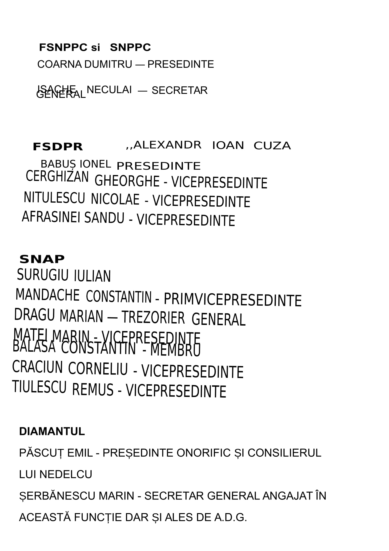 Înainte de a vă prezenta, în foto, lista, trebuie să facem o precizare: în anul 2016 actualul secretar general al „sindicatului” Diamantul, Șerbănescu Marin s-a pensionat. Ulterior, Păscuț Emil s-a pensionat și el. Înainte să se pensioneze cei doi, sindicatul „Diamantul” îi „lovea” pe toți liderii sindicali pensionari M.A.I. și-i arăta cu degetul ca fiind „ilegaliști”, „oportuniști” etc. Când s-au văzut în pragul pensiei Șerbănescu cu Păscuț au schimbat foaia și au început să susțină că „pensionarii diamantini sunt mai buni decât ăialalții. De aceea Păscuț și Șerbănescu trebuie să rămână în viața sindicală… veșnic dacă se poate”.