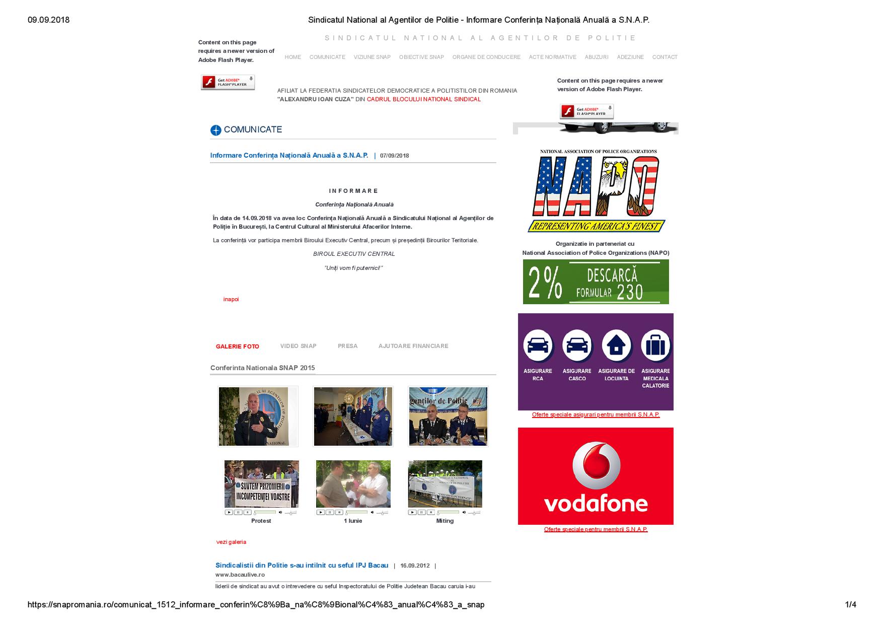 După ce Judecătoria Sectorului 5 „a dat de pământ” cu pensionarii M.A.I. care ocupă funcții sindicale în S.N.A.P. (https://www.incisivdeprahova.ro/2018/09/05/exclusivnuclearajudecatoria-sectorului-5-decis-pensionarii-m-nu-pot-detine-calitatifunctii-sindicale/), pe sitte-ul oficial al acestui sindicat a fost postat vineri, 07.09.2018, mesajul: „În data de 14.09.2018 va avea loc Conferința Națională Anuală a Sindicatului Național al Agenților de Poliție în București, la Centrul Cultural al Ministerului Afacerilor Interne. La conferință vor participa membrii Biroului Executiv Central, precum și președinții Birourilor Teritoriale.”