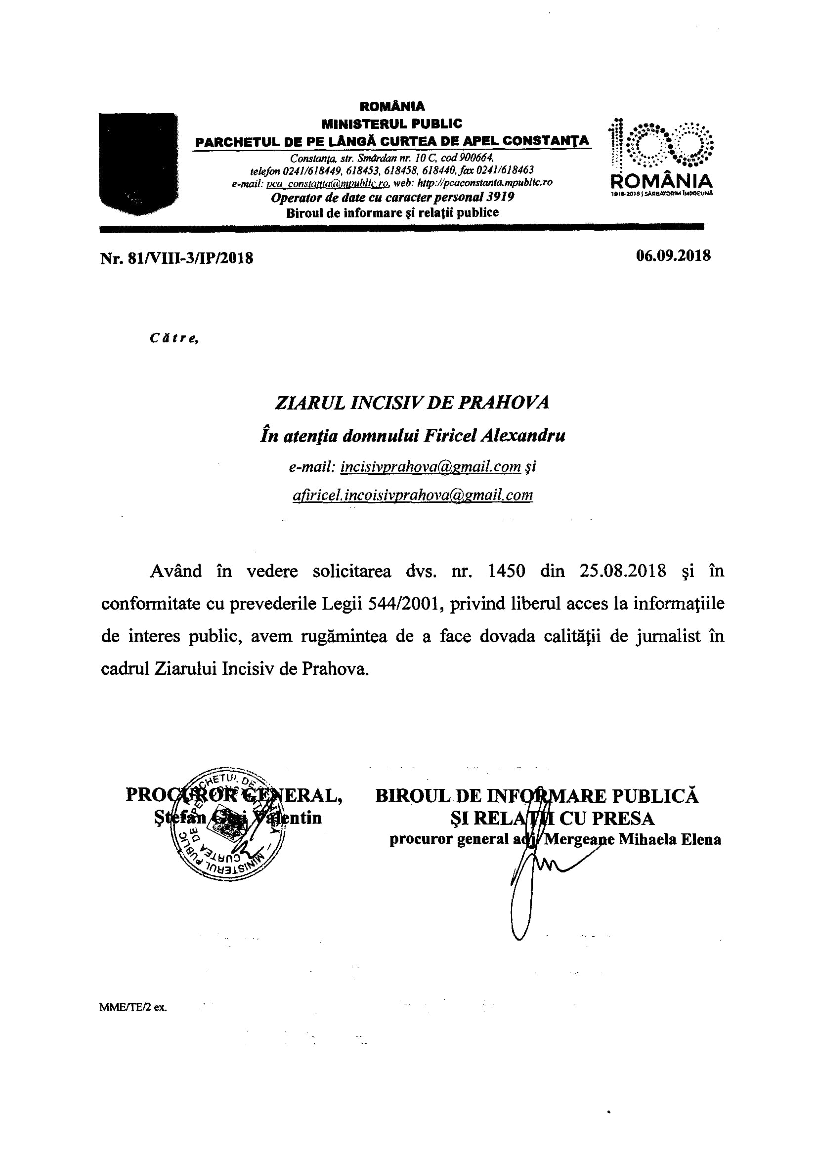 - Procurorul general Ștefan Valentin și procurorul general adjunct Mergeane Mihaela Elena care conduc Parchetul de pe lângă Curtea de Apel Constanța sunt în top (credem noi): cei doi „șefi de experți în drept” susțin că nu ne pot furniza informațiile publice solicitate fiindcă „nu a fost făcută dovada calității de jurnalist” în condițiile în care art.31 alin.(1) și (2) Constituție prevăd accesul liber și neângrădit al oricărei persoane la informații de interes public. Iar normele de aplicare ale Legii nr.544/2001 prevăd că orice persoană poate solicita și primi informații publice chiar și dacă solicită verbal, fără a declina o calitate.