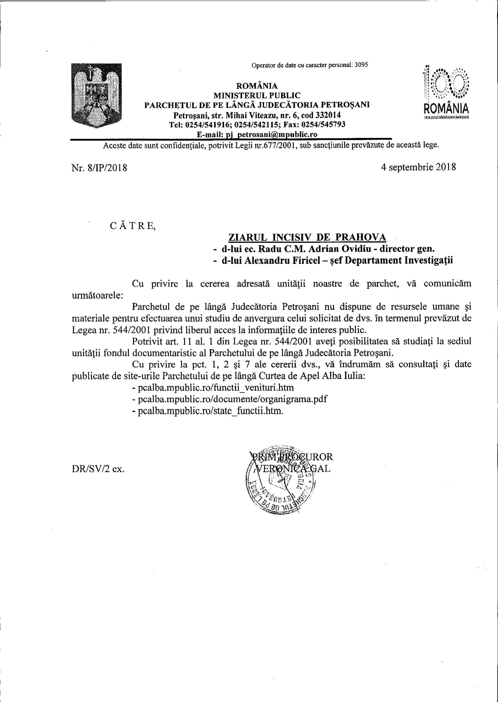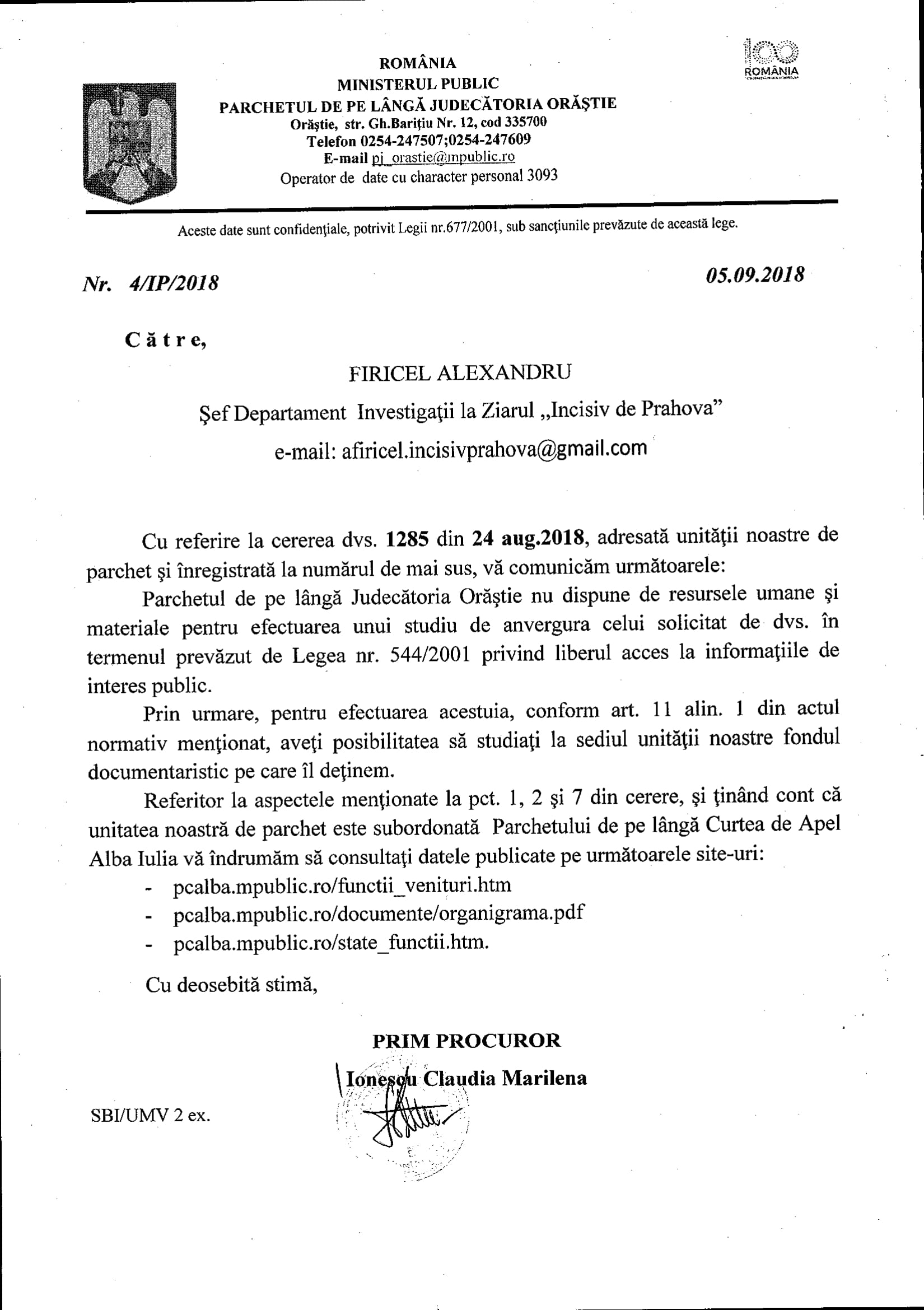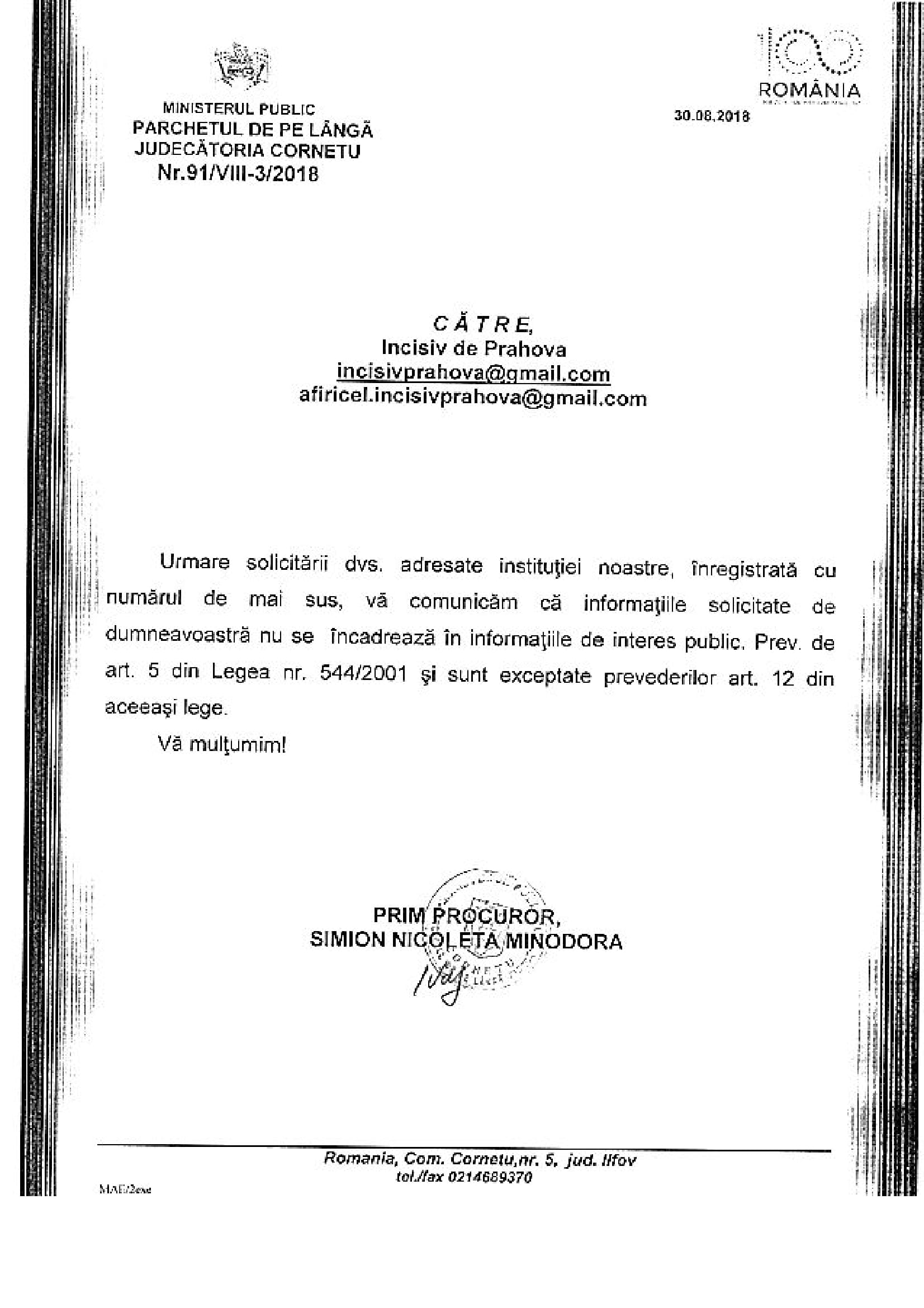 - Adresa Parchetului de pe lângă Judecătoria Cornetu este COLOSALĂ! O tăntică Simion Nicoleta Minodora (prim procuror dealtfel) susține că informațiile solicitate sunt exceptate de la liberul acces la informații publice. Păi băi cocoană, nu ți-am cerut date din dosare ci date despre dosare nesoluționate, fără să solicităm date de identificare ale părților! Venitul mătăluță e informație publică, coană „procuraură”, că ești angajat al statului în funcția de „acuzator public”!
